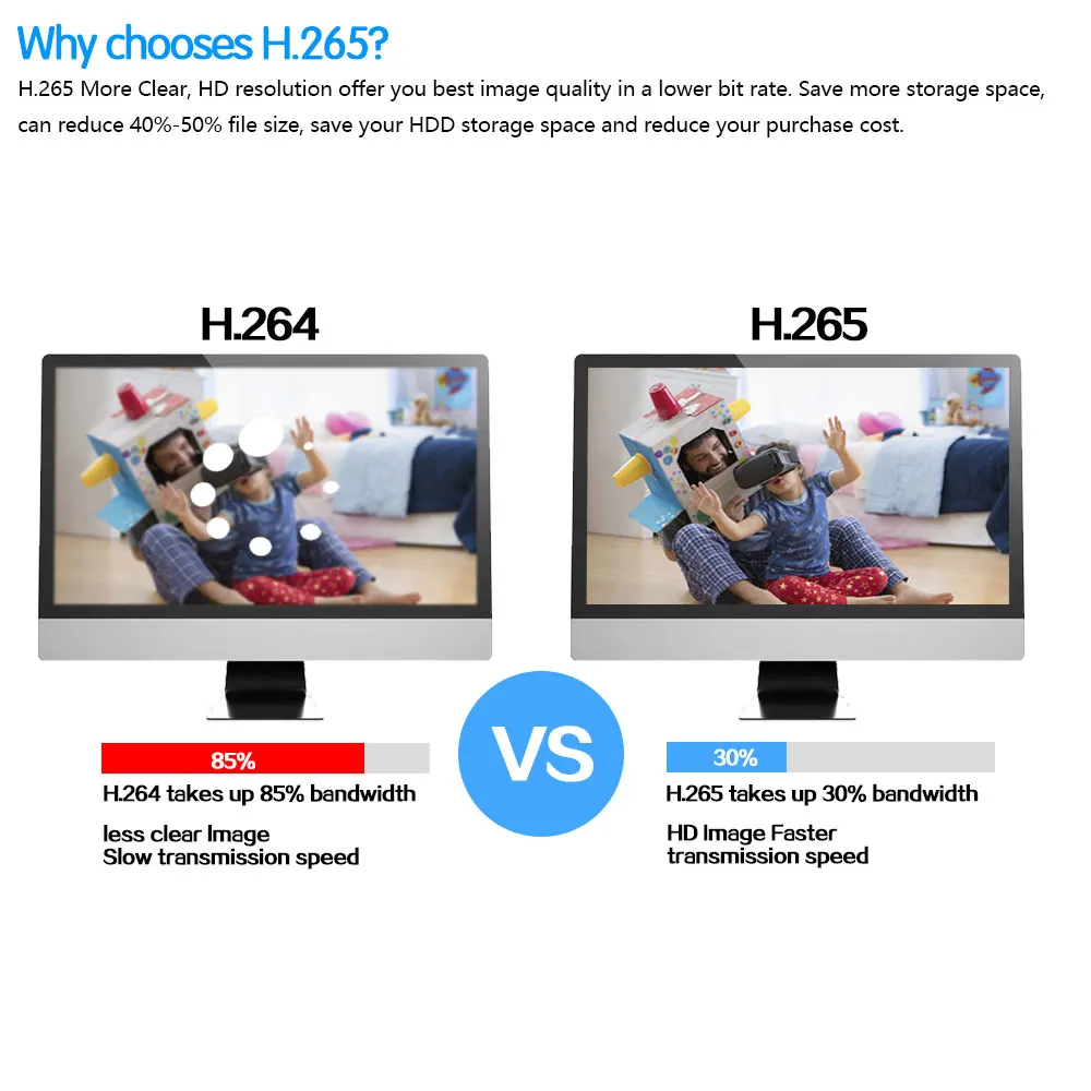 H.265 более четкий, HD разрешение предлагает вам лучшее качество изображения в более низкой скорости. Экономьте больше места для хранения, вы можете уменьшить размер файлов 40%-50%, сэкономить место для хранения HDD и снизить стоимость покупки.