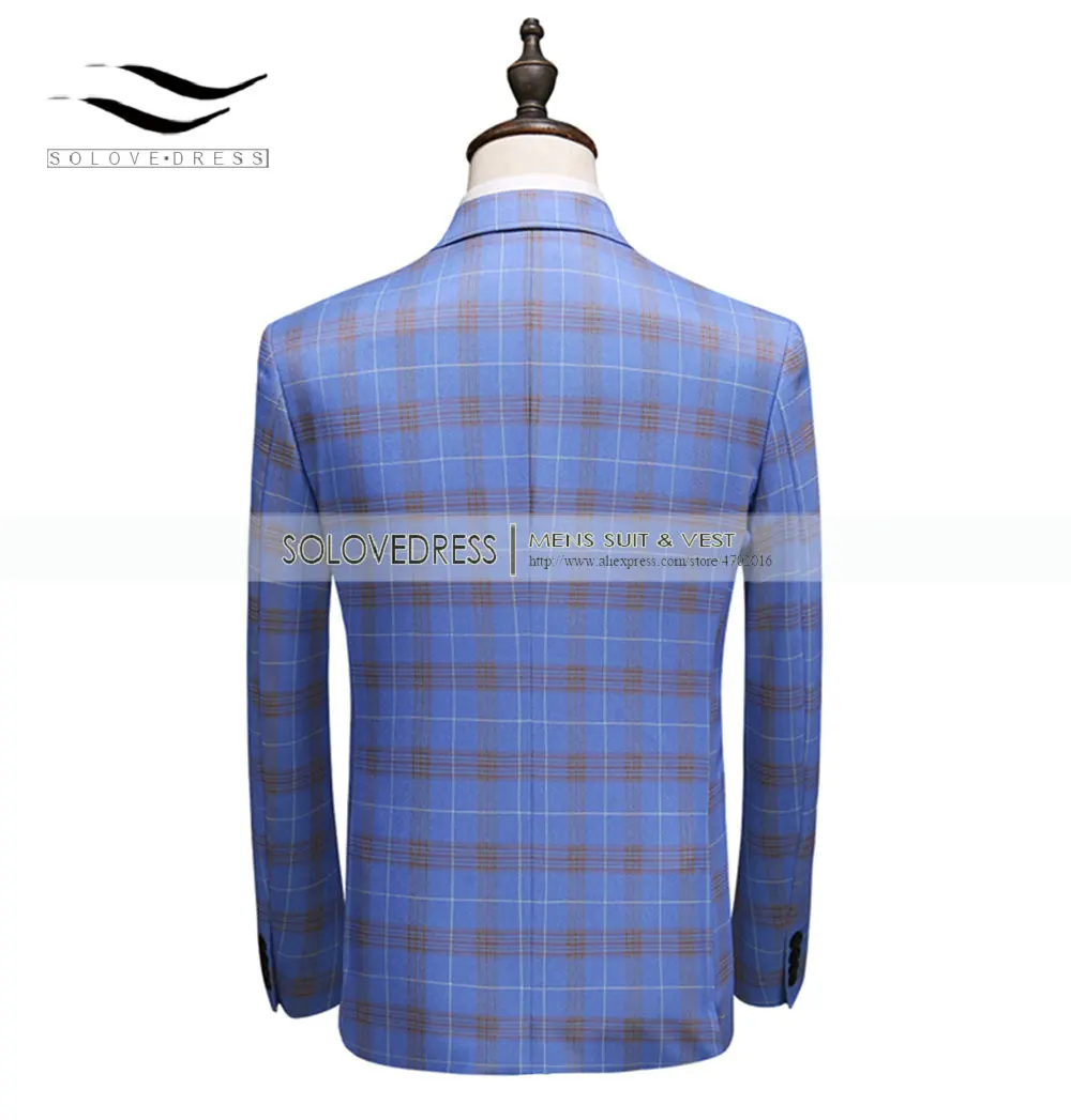 Мужской костюм, двубортный клетчатый смокинг для мужчин, светильник-синий классический дизайнфрак жениха, мужской комплект из 2 предметов (Блейзер + брюки)