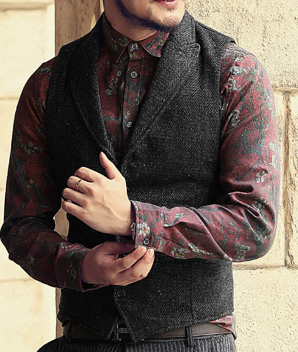 Для мужчин, классический костюм с жилетом с узором елочка шаблон жилет для делового костюма лацкан с тупым углом; Шерстяное твидовое Женихи Для мужчин жилет для свадьбы