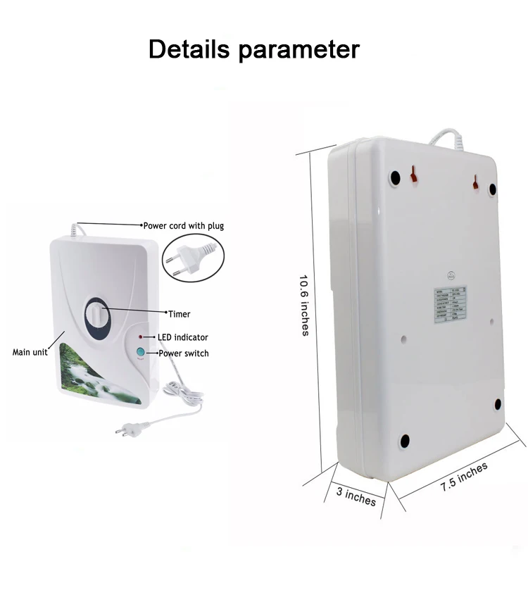 Параметры:*Напряжение: AC110V 60Hz для штепсельной вилки США, AC 220V 50Hz для штепсельной вилки ЕС.* Номинальная мощность: 8 Вт.* Выход озона: 600 мг/ч.* Время работы: 1 - 60 минут.