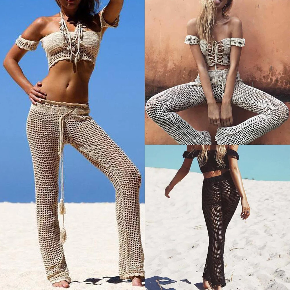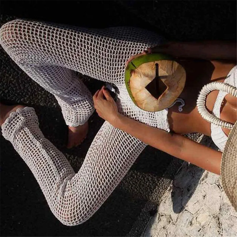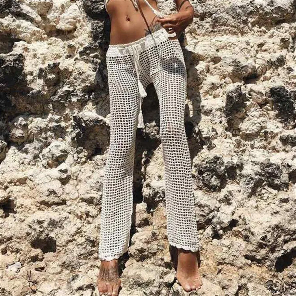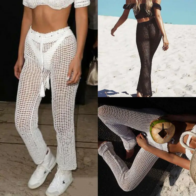 Женская пляжная одежда, брюки в сеточку, крючком, ажурные прозрачные широкие брюки