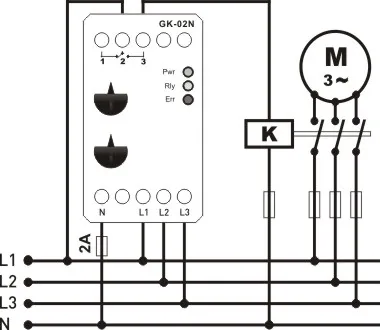 Сделайте соединения в соответствии с схемой. Установите устройство в соответствии с требуемой электрической зарядкой. Когда питание включено, если напряжение такое же, как и отрегулировано, реле led включается и реле тянет. В этом случае контакт (нет) 3 полюса. Когда значения напряжения avnormal, релейные релизы и светодиод выключены после ожидания, пока не будет установлено время. В этом чехол contact out is (NC)1.GK-02N тип имеют соответствующие светодиоды для низкого напряжения и фазового выхода из строя.