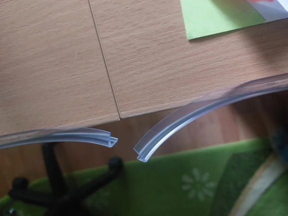 Силиконовая лента выглядит хорошо, прозрачна я, без оттенка, аккуратно смотрится на уголке мебели. В комплекте идёт тоненький 2сторонний скочч. Силикон немного тянется, но в натянутом состоянии отклеивается от скочча, как в общем и в ненатянутом(( Придётся покупать более качественный скочч.