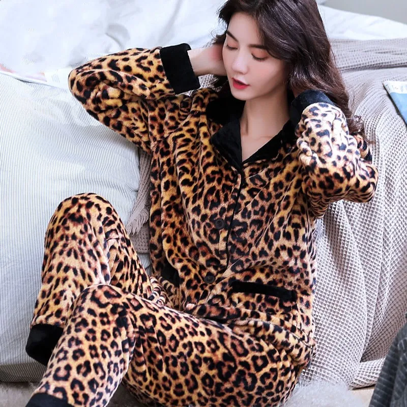Пижама женская, теплая, фланелевая, с леопардовым принтом