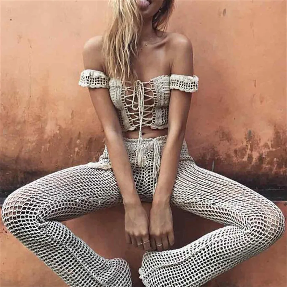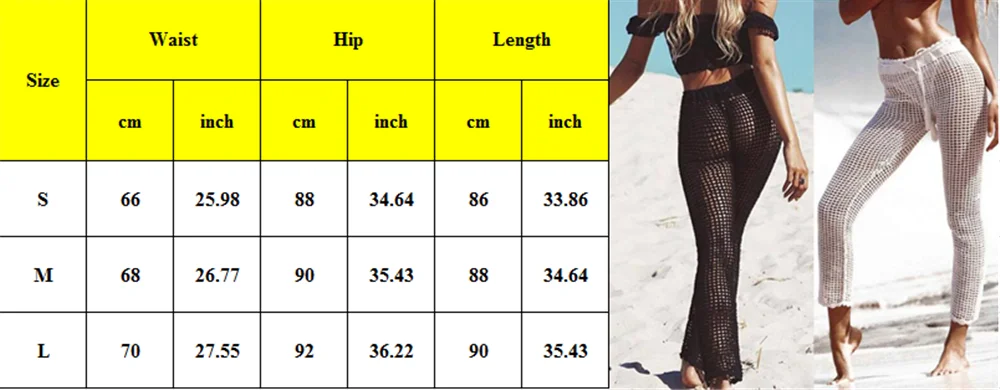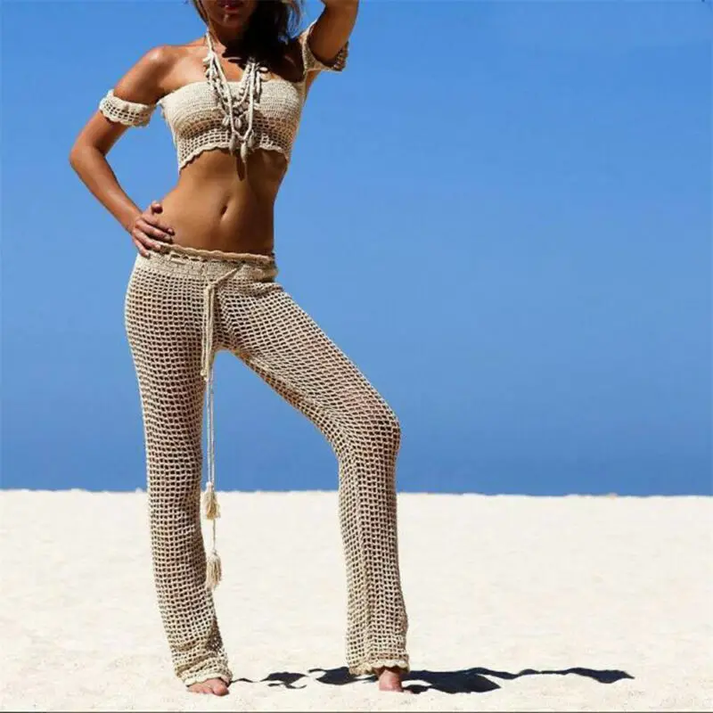 Женские пляжные сетчатые брюки, вязаные крючком ажурные сетчатые широкие брюки