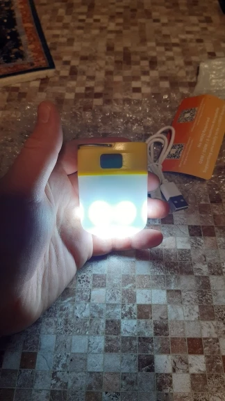 Быстрая доставка,9 дней.Соответствует описанию.4 режима:яркий(около100 люмен),средний(около 50),стробоскоп,SOS по удержанию более 3 секунд из любого режима. Имеется магнит и кольцо для подвески.Хорошая альтернатива кемпинговому фонарю одной известной фирмы.Емкость аккумулятора пока не проверял.