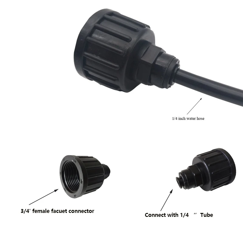 Размер: 10 метров Цвет: черный Трубка: Полиэтиленовая водяная трубка 1/4 дюйма (внешний диаметр: 6,35 мм; Внутренний диаметр: 4 мм) Сопло: латунное запотевающее сопло с отверстием 0,1 мм ~ 0,8 мм Соединитель смесителя: внутренняя резьба смесителя 3/4 дюйма