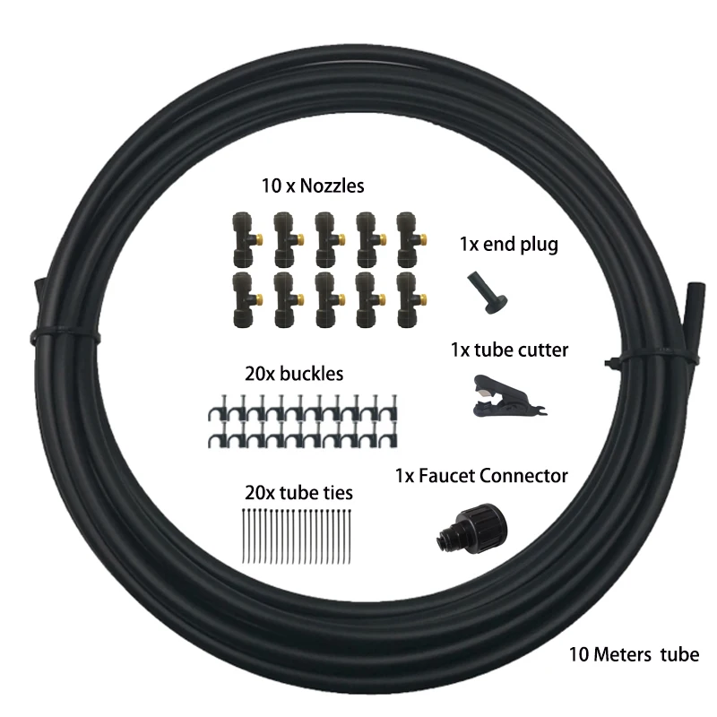 10X метров 1/4 ''PE трубка Латунные форсунки для запотевания, 10 шт. 10 штук насадок (тройник) 1 труборез 20 штук пряжки для труб 20 шт. пилинговых галстуков 1x штекер 1x соединитель для смесителя