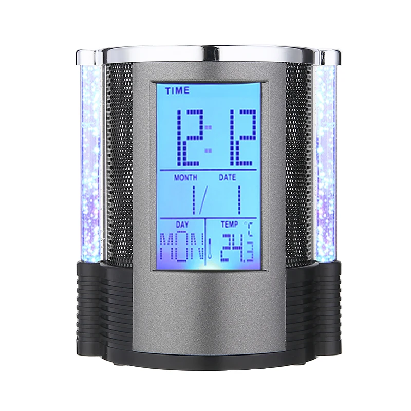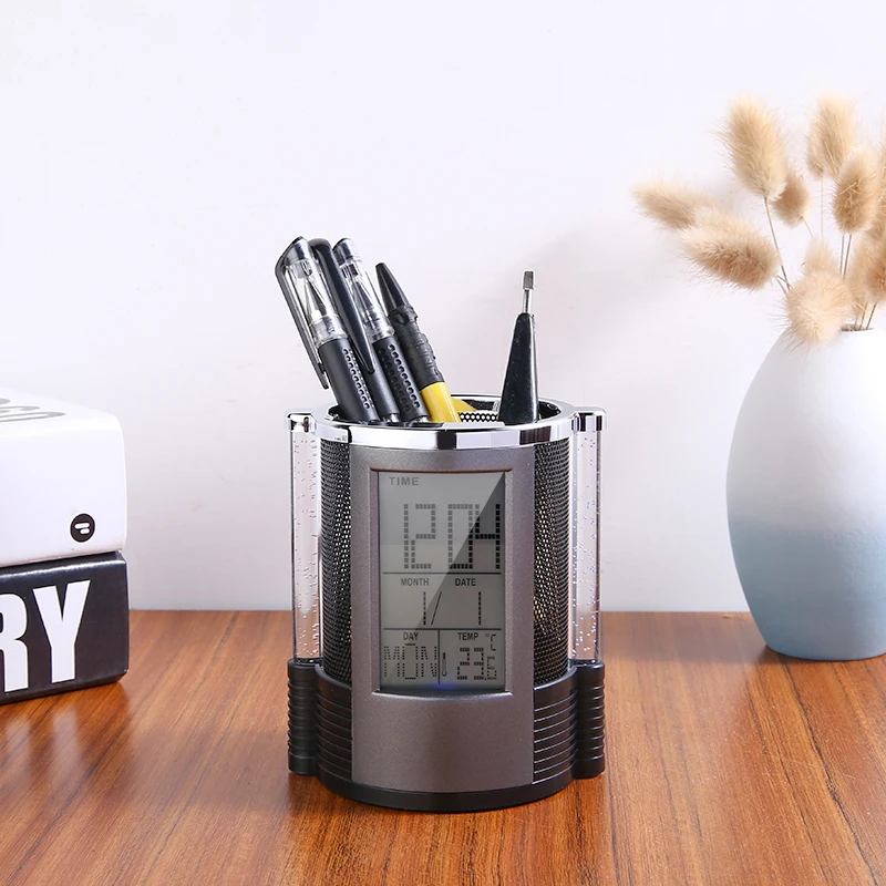 Сетчатый держатель для карандашей со светодиодный светильник кой, настольный ЖКД линейки с сигнализацией, держатель ручки для часов, офисный Настольный Органайзер