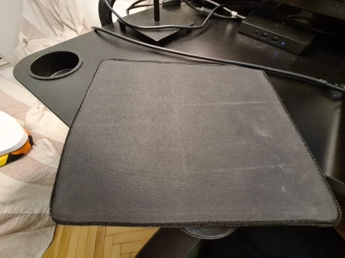 Очень даже не плохой ковер. Шов незаметный. Единственное что стоит отметить модуль управления светом немного поднимает от стола коврик. При меньшем размере наверное было бы более ощутимо.