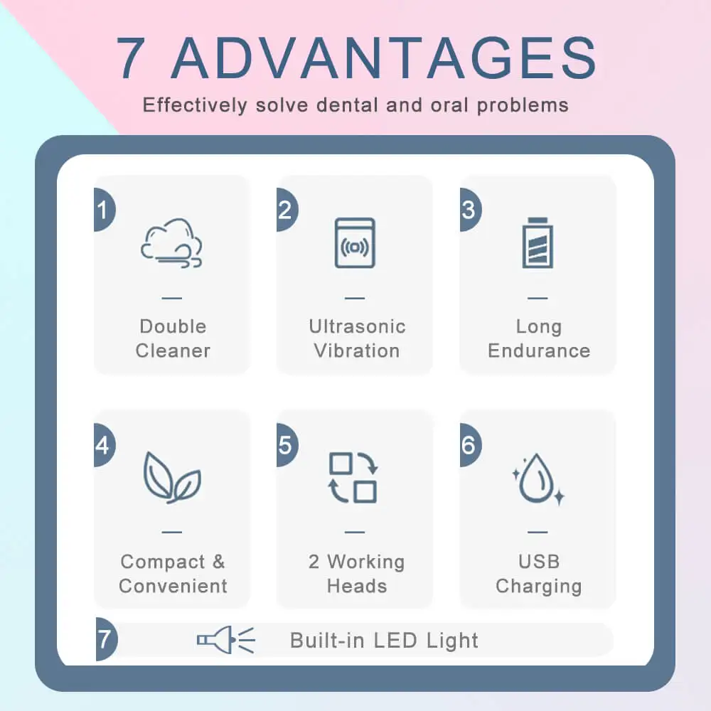 ✅Головка зубной щетки и чистящая головка в наличии✅Профессиональные инструменты для ухода за зубами✅Четыре вибрирующих режима регулировки✅Ультразвуковая вибрация (до 31 000/мин)✅USB зарядка и IPX6 Водонепроницаемый✅Управление одной кнопкой✅Премиум материалы✅Встроенный светодиодный светильник