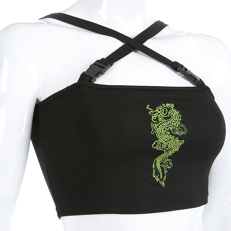Пикантная обувь с пряжкой; С вышивкой в виде черного дракона; Майка для женщин укороченная уличная одежда сексуальные топы 2020 летний бюстгальтер без косточек кроп Топ