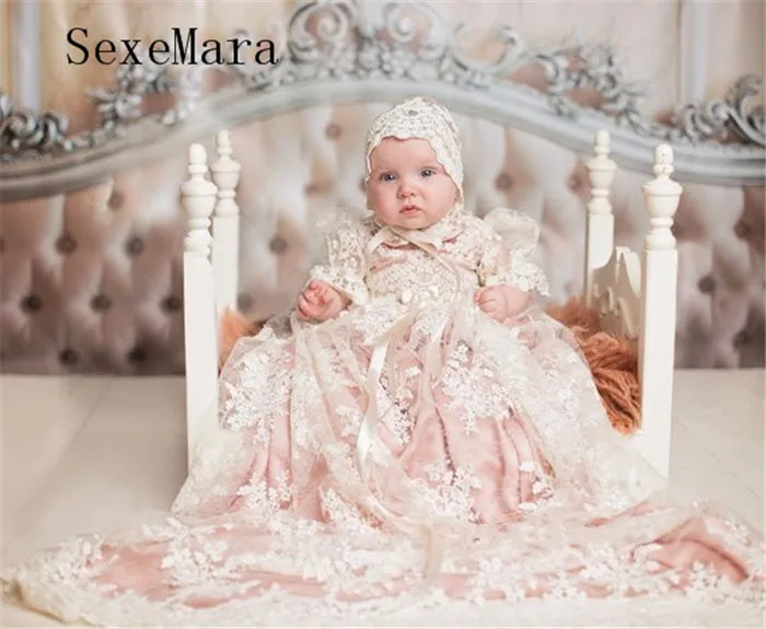 Роскошное платье для крещения с жемчугом, винтажное кружевное плать...