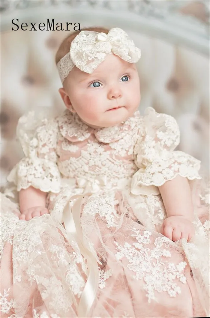 Новое платье на крестины платье для маленьких девочек Одежда для младенцев Кружевная аппликация, комплект румян фамильный наряд с головным убором