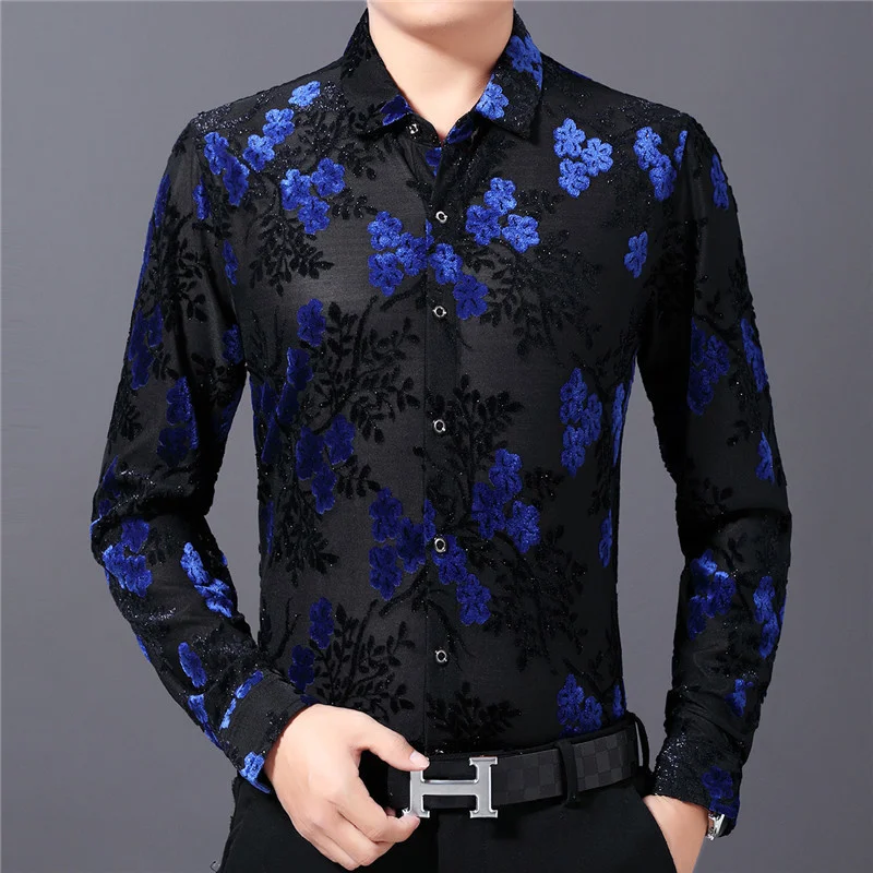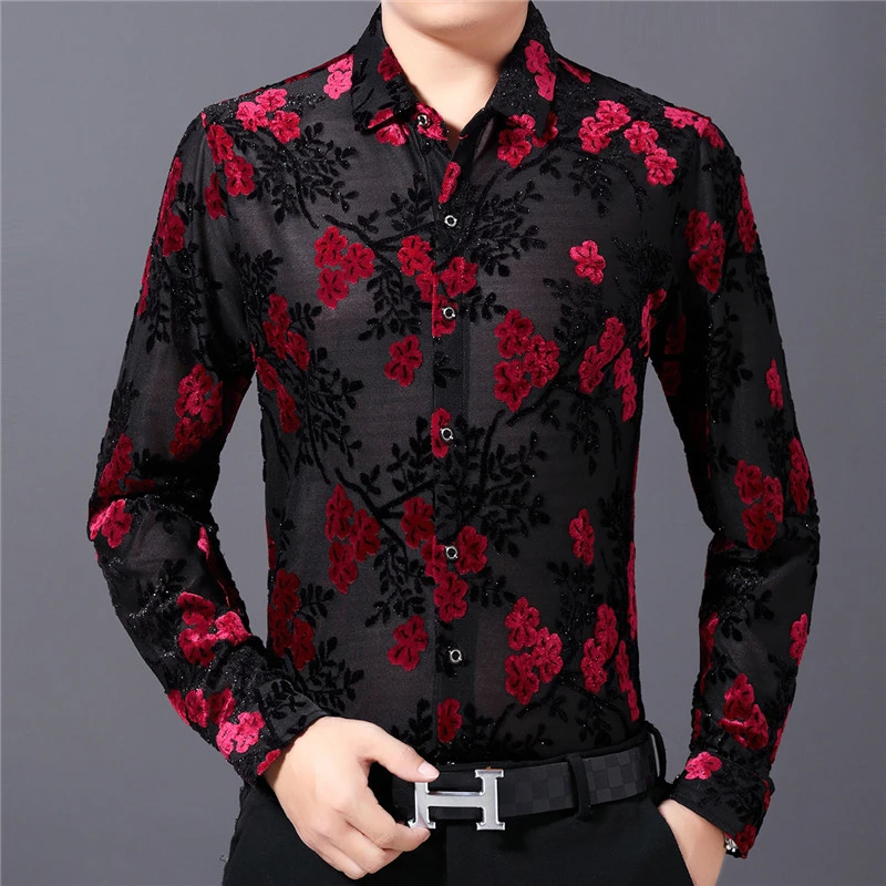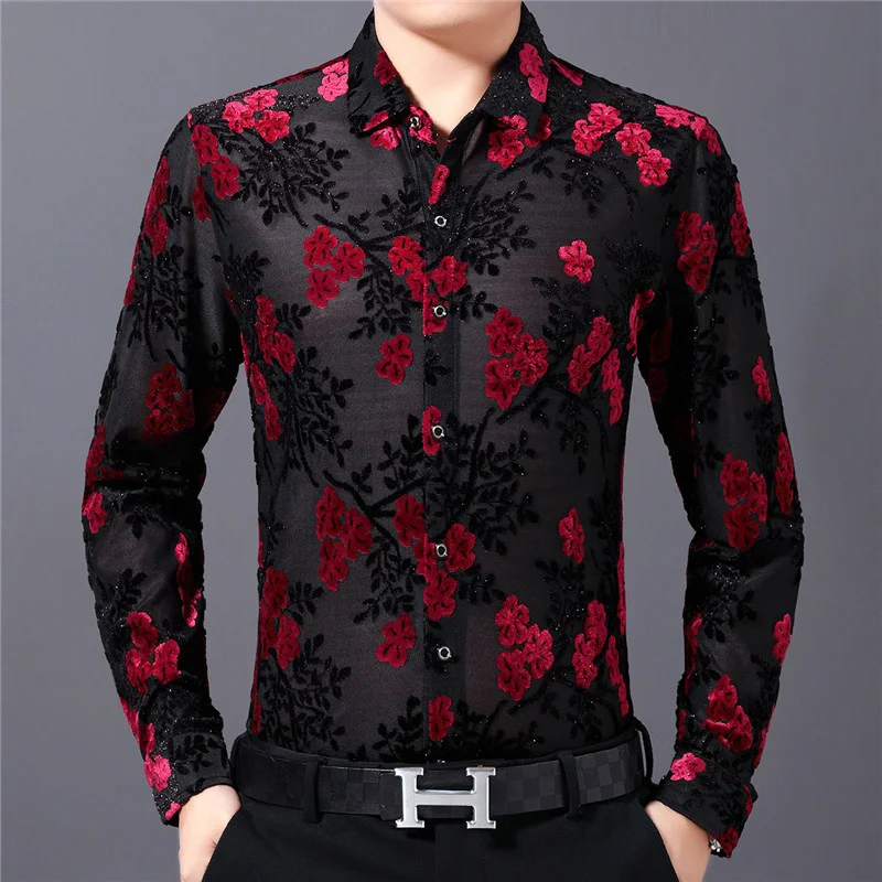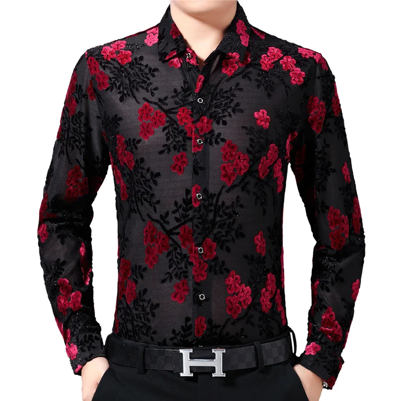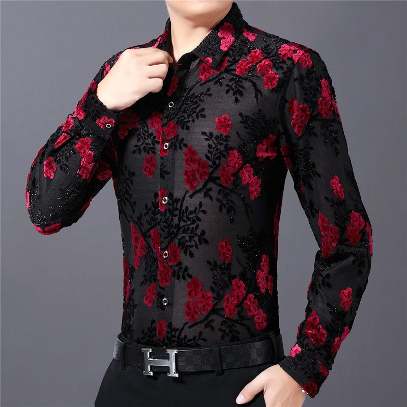 Мужская приталенная прозрачная рубашка, красная бархатная Клубная вечерняя рубашка с длинным рукавом и цветочным принтом, весна 2020