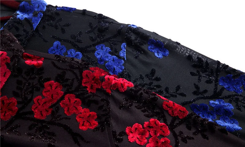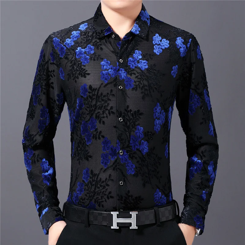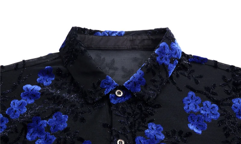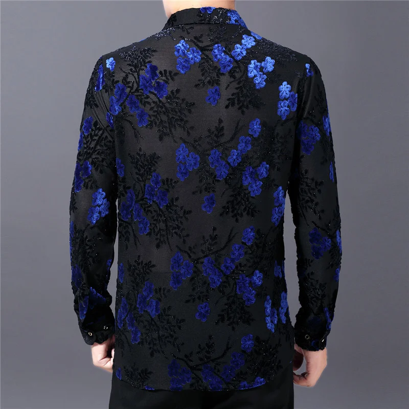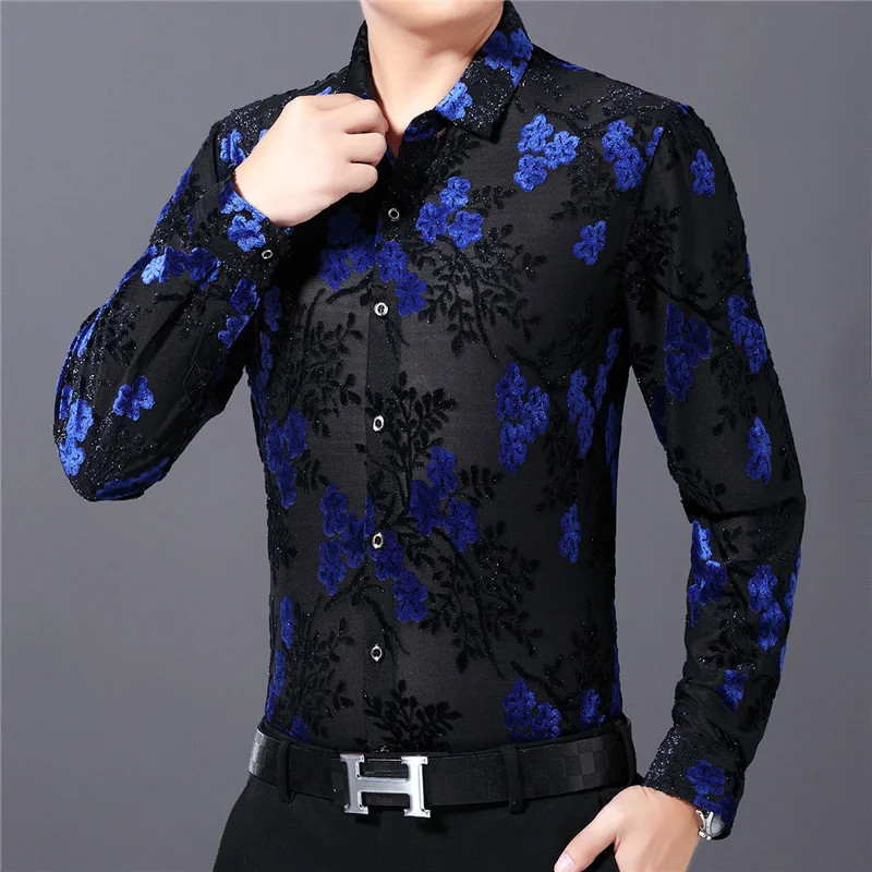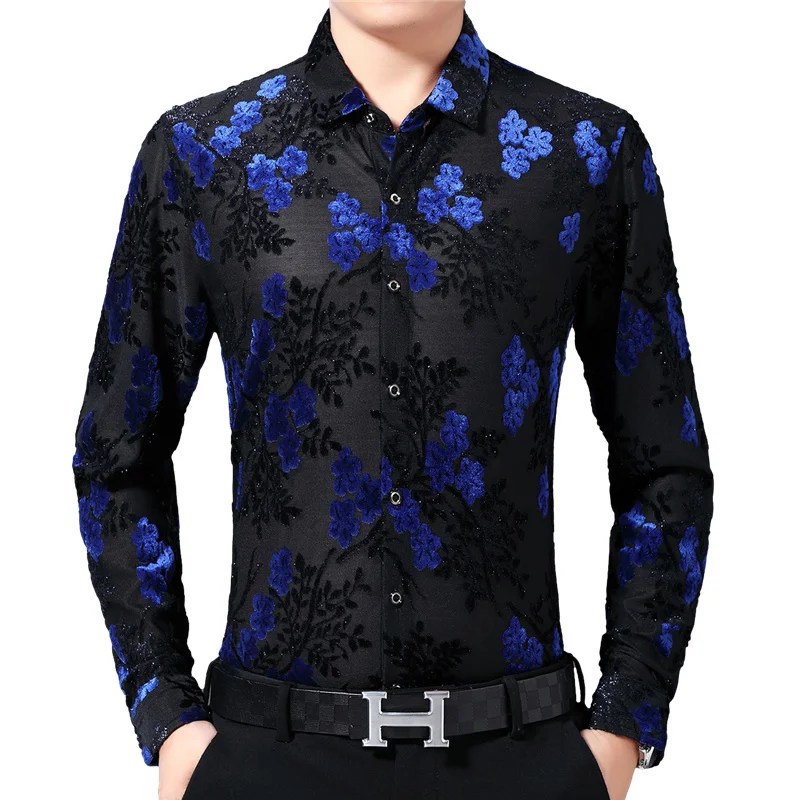 Мужская приталенная прозрачная рубашка, красная бархатная Клубная вечерняя рубашка с длинным рукавом и цветочным принтом, весна 2020