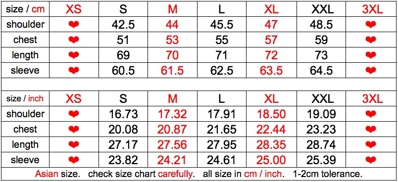 Пожалуйста, проверьте таблицу размеров и измерьте вашу куртку, как показано ниже.