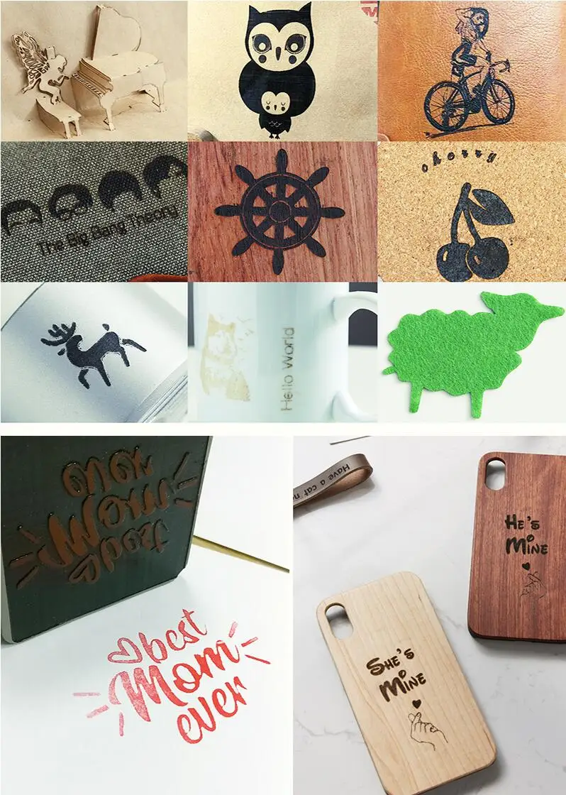 Могут быть выгравированы в дереве, бамбуке, бумаге, лазере, коже, резине, губке, расческе, бумажнике или других горючих лазерах.