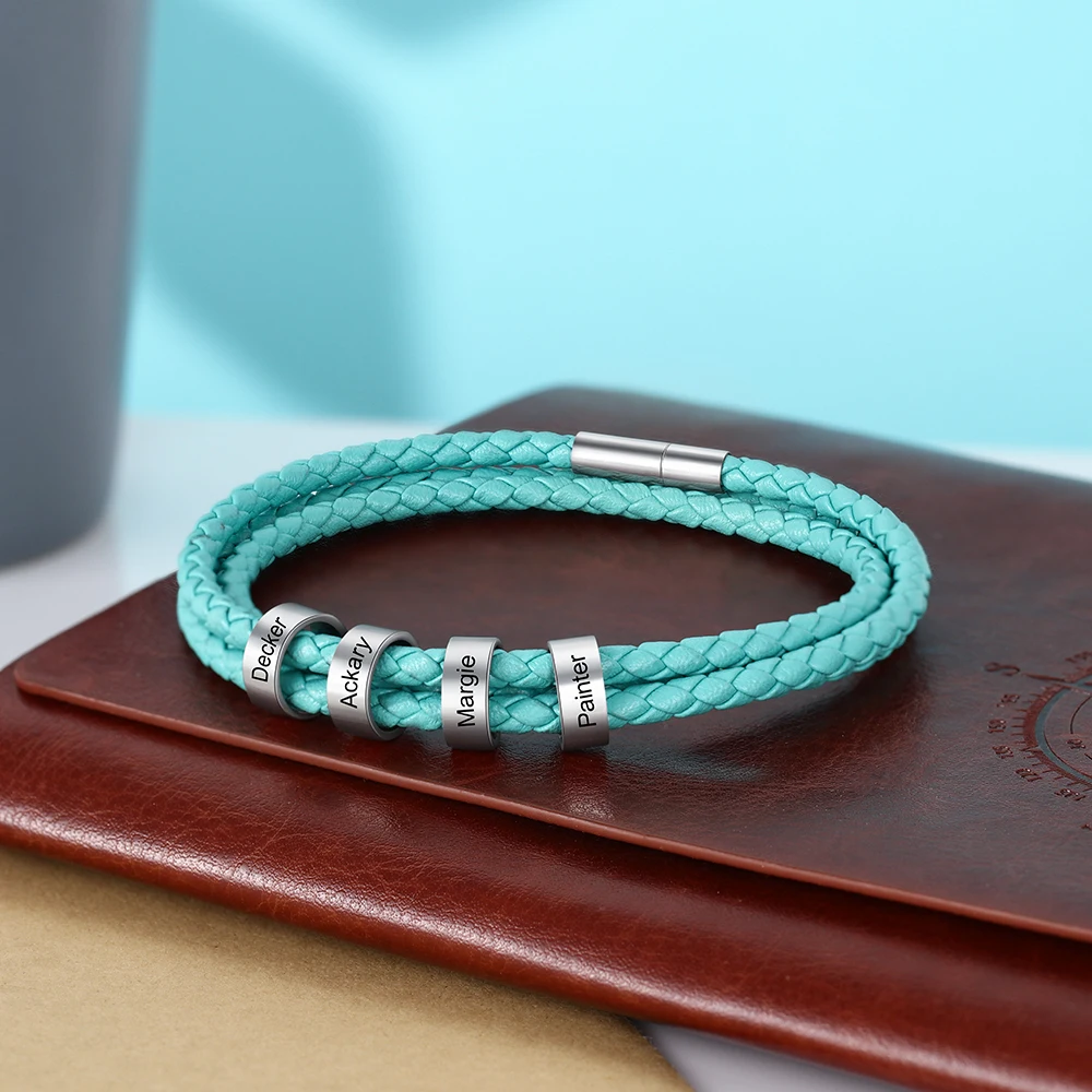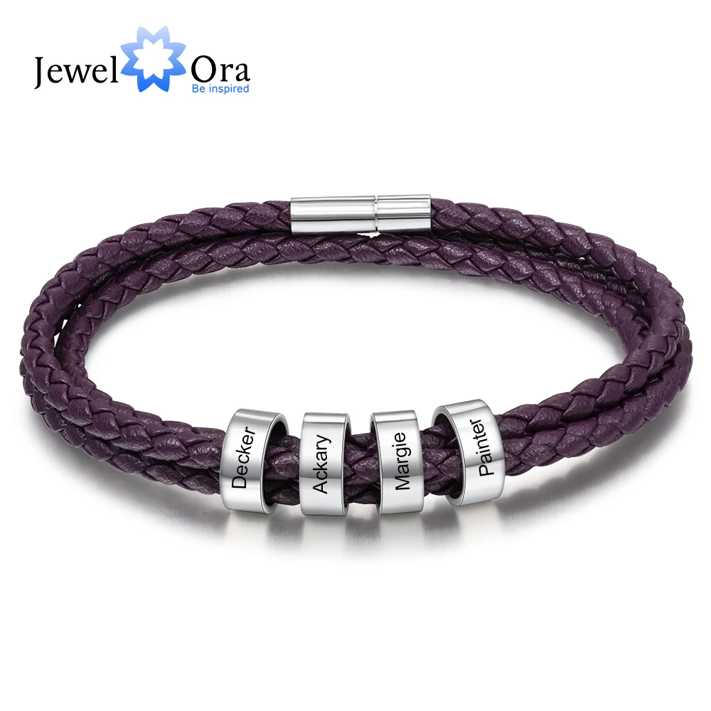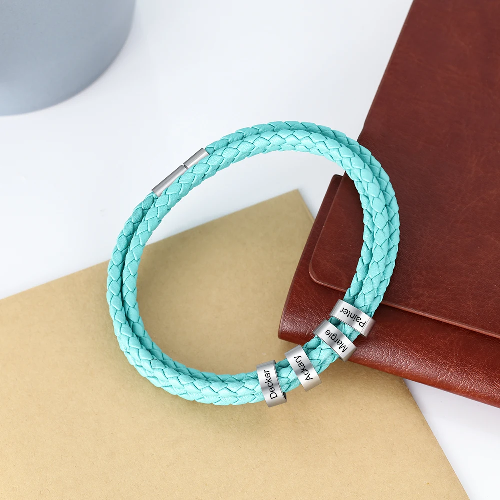 Персонализированный браслет с гравировкой имени и 4 бусинами, индивидуальные разноцветные кожаные браслеты для мужчин и женщин, ювелирные изделия из нержавеющей стали