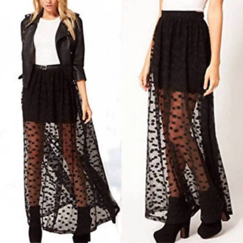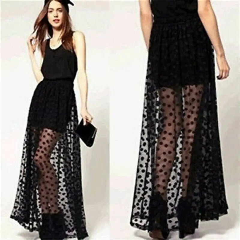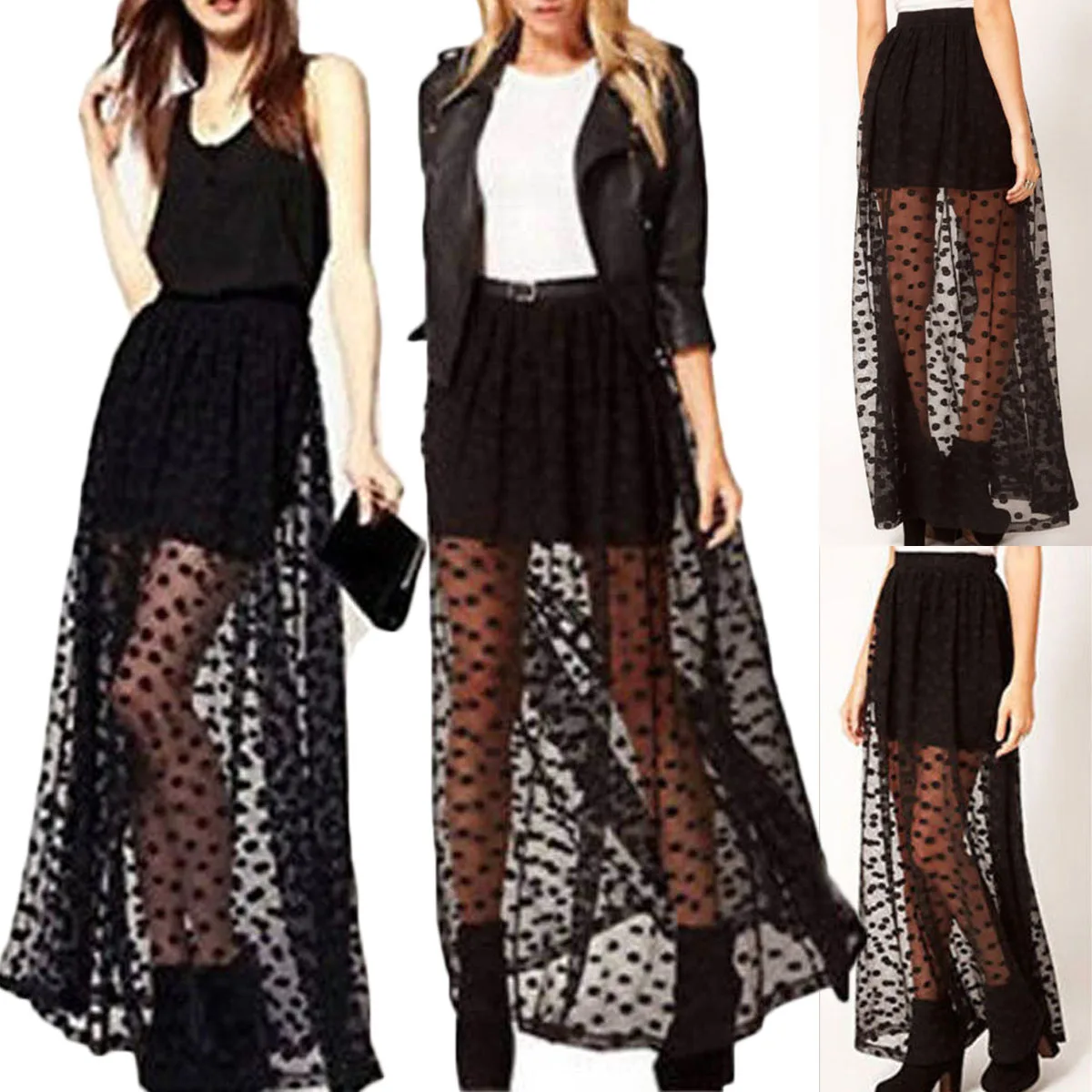 Женские сексуальные юбки, черные юбки макси в горошек, сексуальные прозрачные Бальные длинные юбки из тюля, летние женские модные повседневные юбки