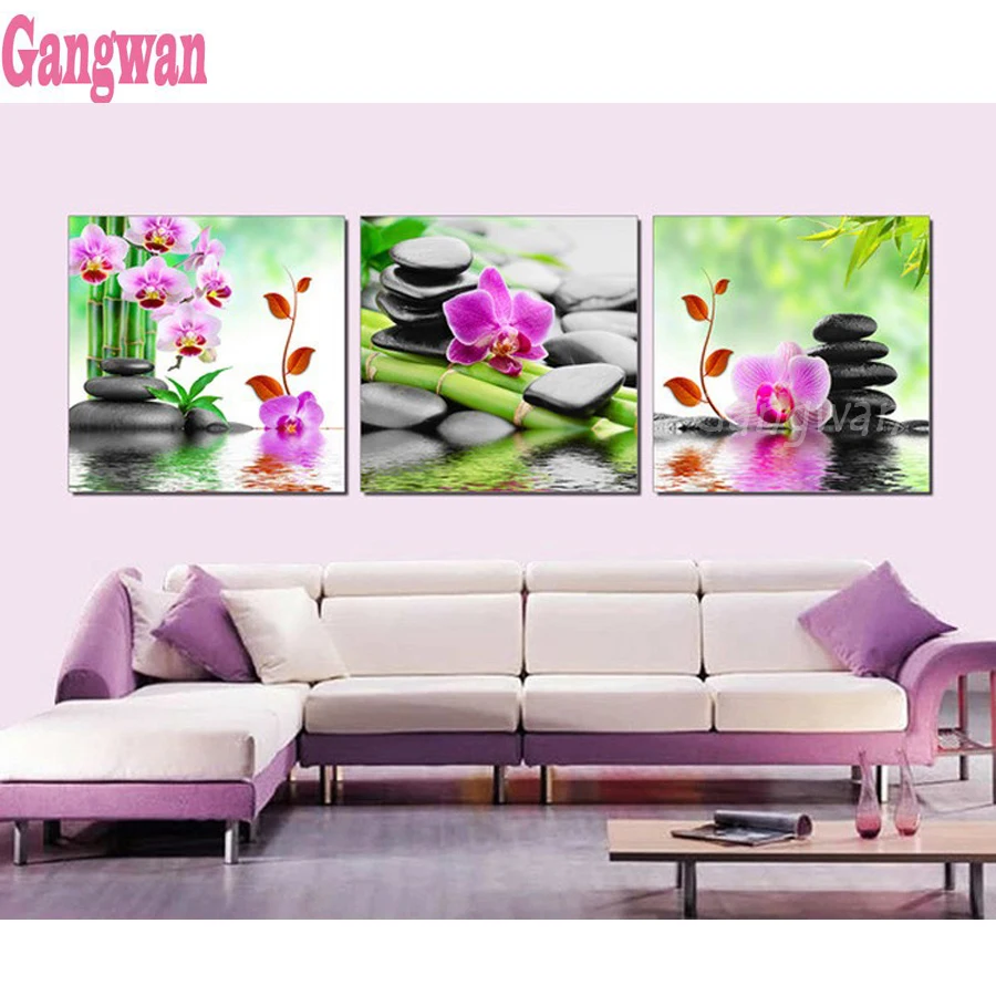 5D Diy квадратная Алмазная картина Орхидея, наборы крестиков, мозаичная живопись, бамбук, черный Spa Zen Stone, 3 шт., рисунки, вышивка, искусство