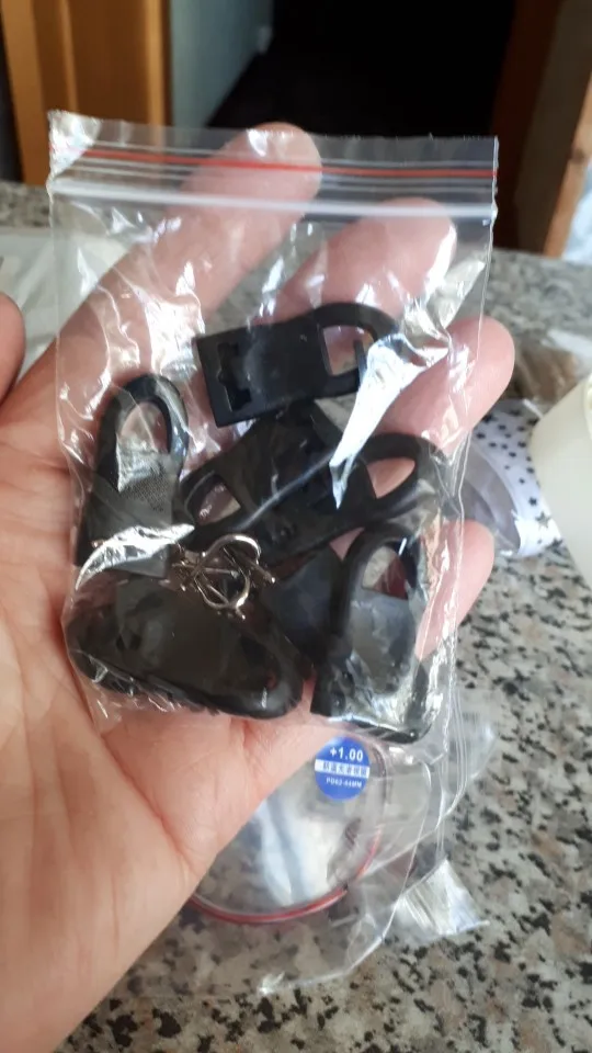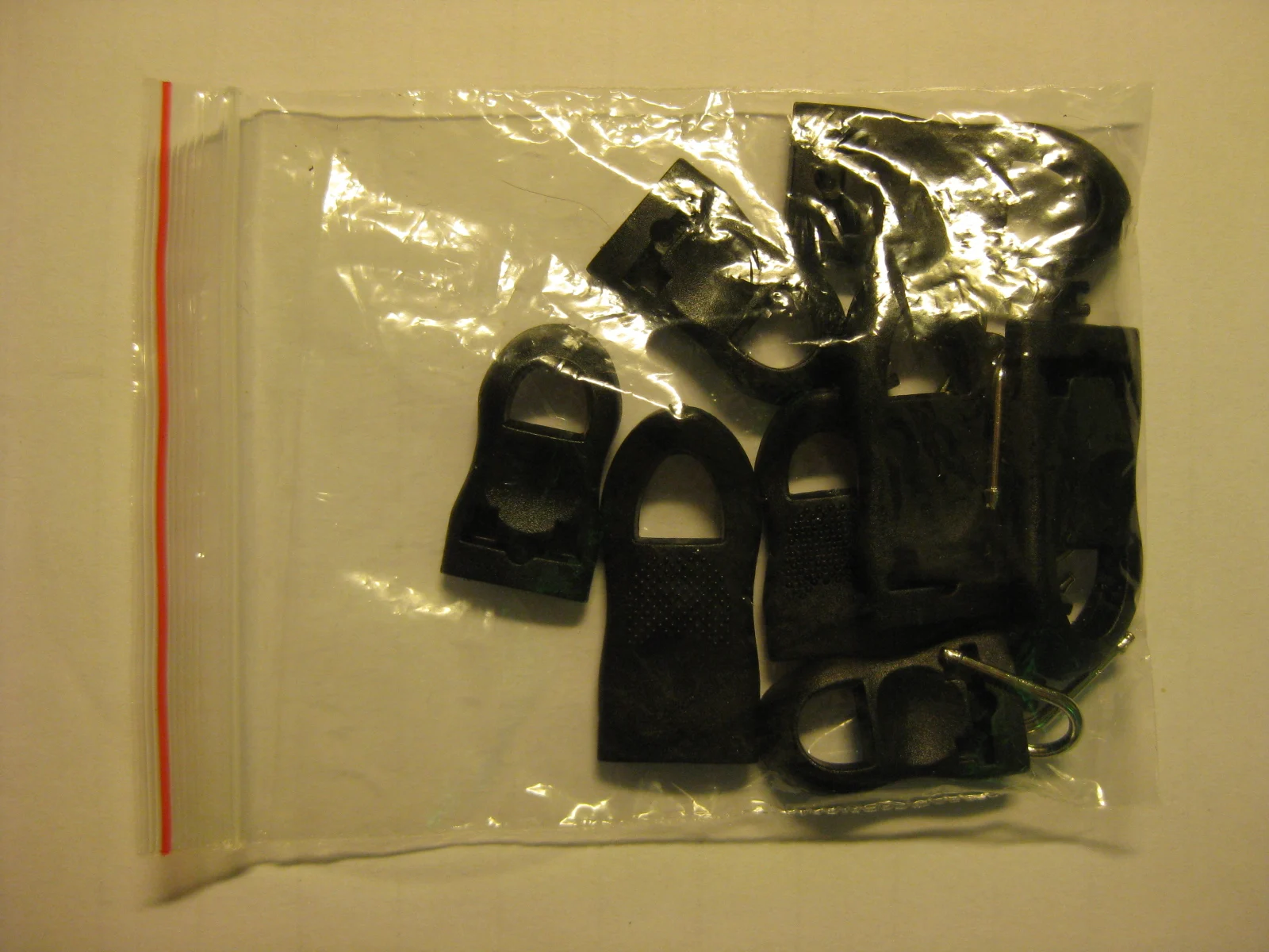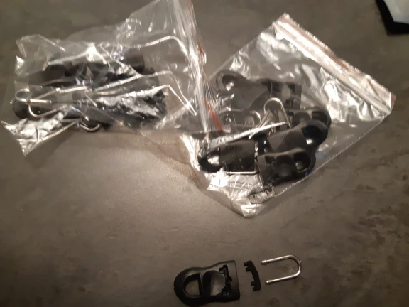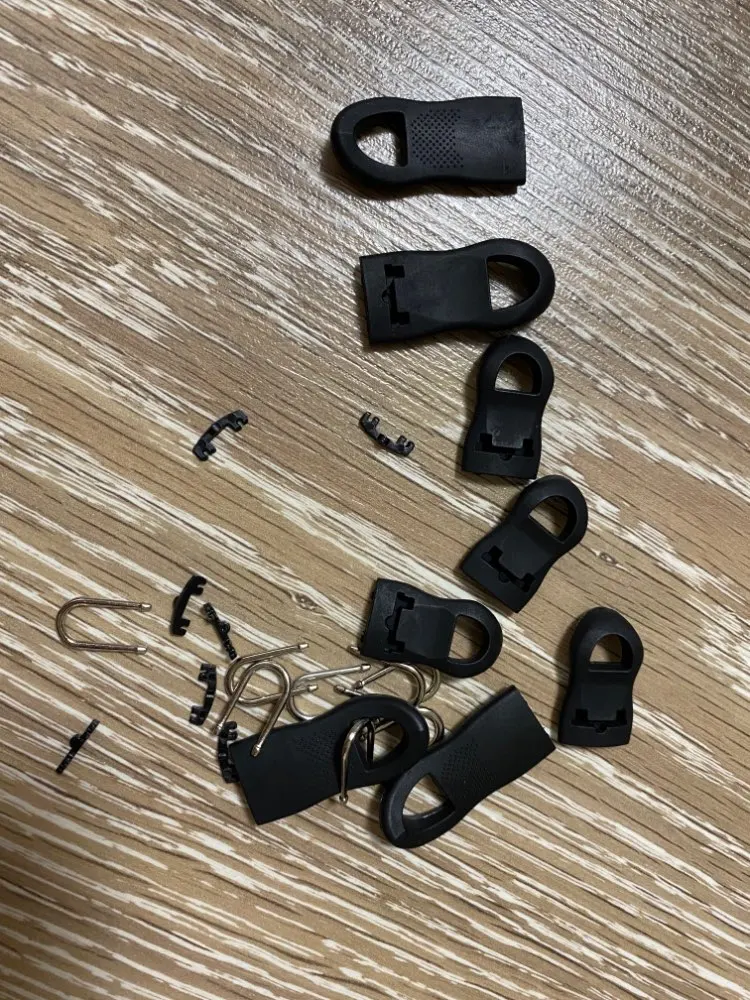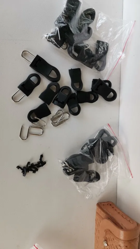 Застежки довольно крупные. Каждая застежка из трех частей - сама пластиковая ручка, металлическая проушина и пластиковая заглушка. Заглушку лучше сразу на суперклей сажать, чтоб не болталось. Качество нормальное. Покупала для молний на гитарном чехле.