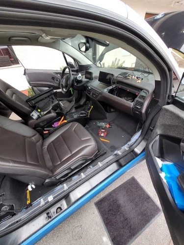 В i3 этот набор можно легко и лучше положить под спинку сиденья. Кабели не должны быть расположены спереди. Антенна Wi-Fi и дополнительный порт USB могут быть пропущены. Оригинальный Bluetooth и usb-порт в центральной консоли могут быть использованы для модификации Carplay. Предложение для улучшения: Толстый кабель может быть намного короче с размещением под задним сиденьем, поэтому нет необходимости в соединительном кабеле длиной 4 м.