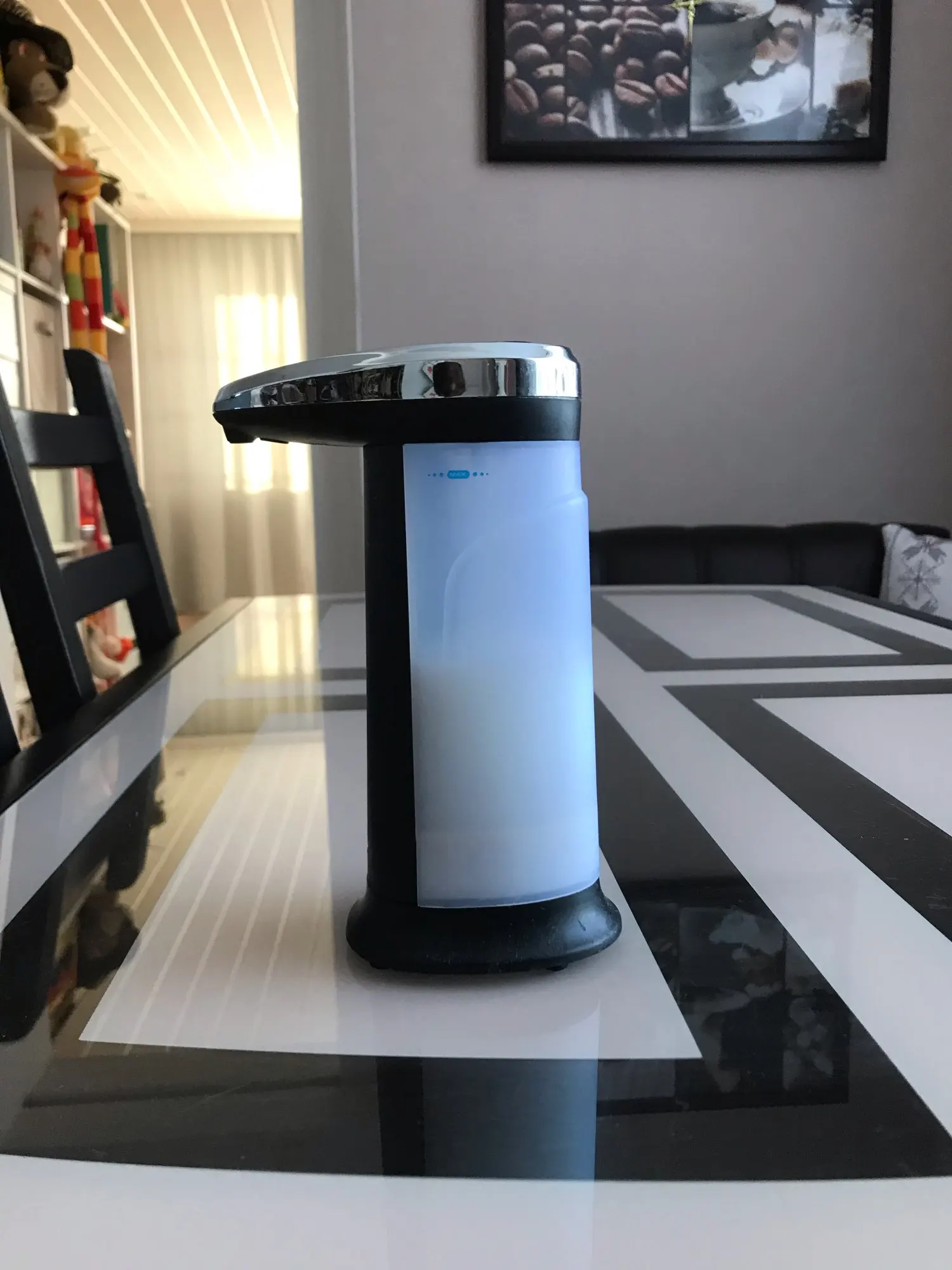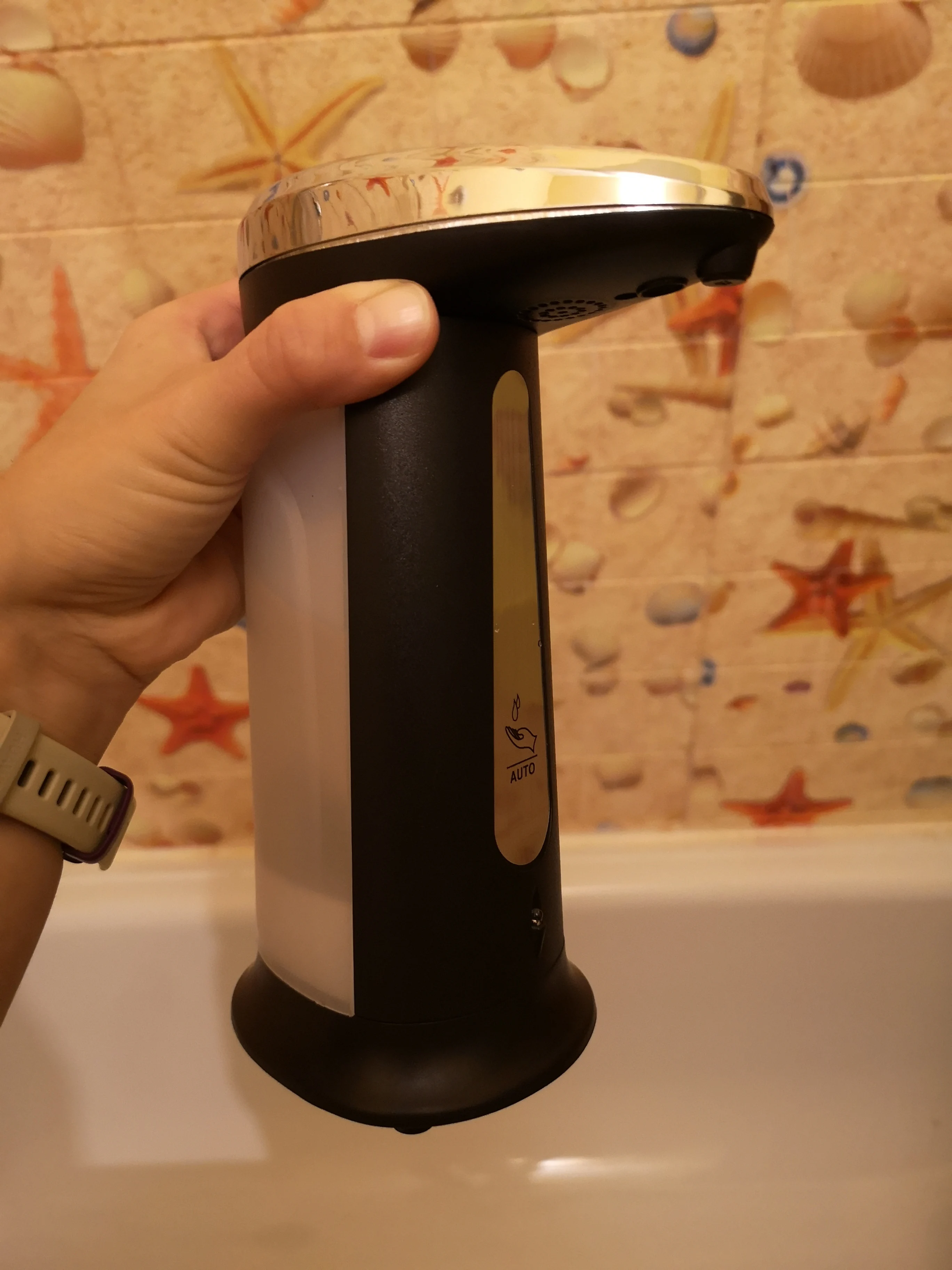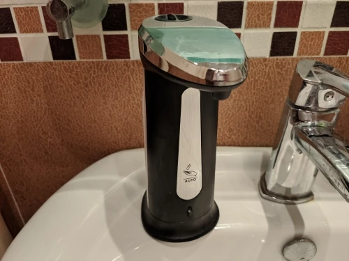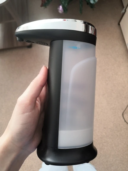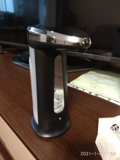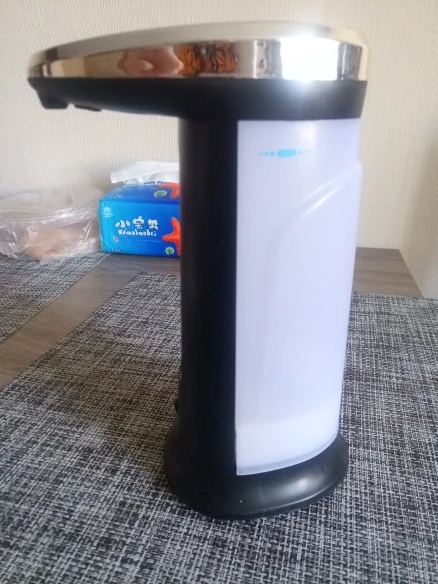 Классный диспенсер, пришёл очень быстро, 2 недели до МО при условии, что заказ был сделан перед Новым годом. Диспенсер сенсорный, реагирует на руку, емкость для мыло подсвечивается, по окончанию подачи мыла падает звуковой сигнал. Не совсем поняла от чего зависит доза мыла, но есть предположение что от размера руки, сыну меньше подаёт чем мужу или мне. Работает от 4 батареек.