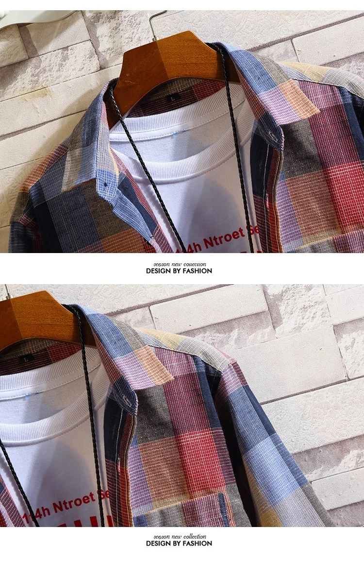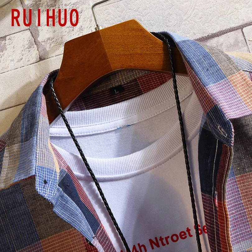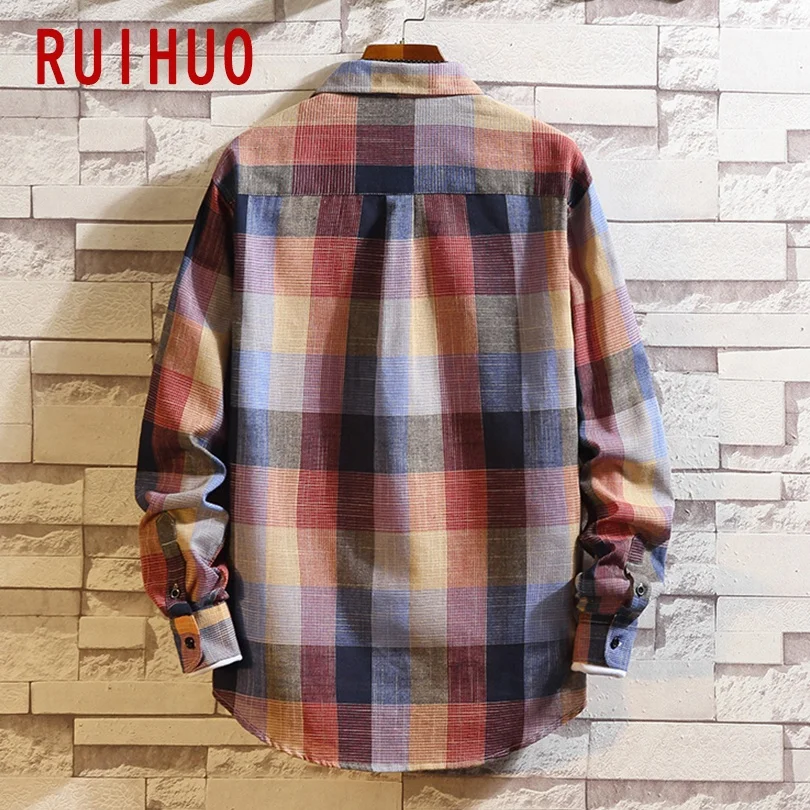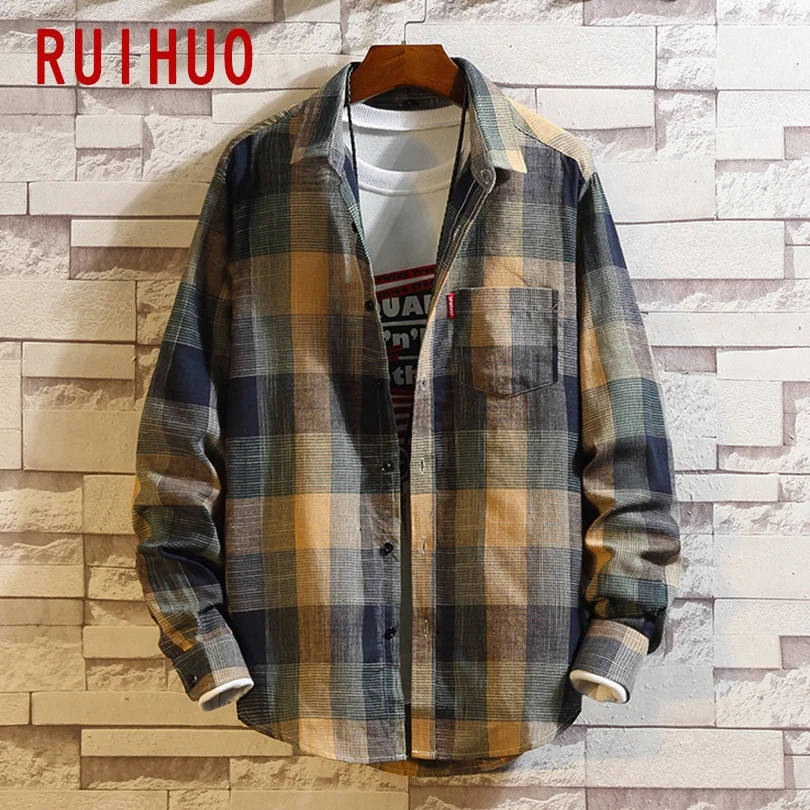Рубашка RUIHUO мужская в клетку, Повседневная блуза из хлопка, приталенный силуэт, с длинным рукавом, с отложным воротником, весна 2022
