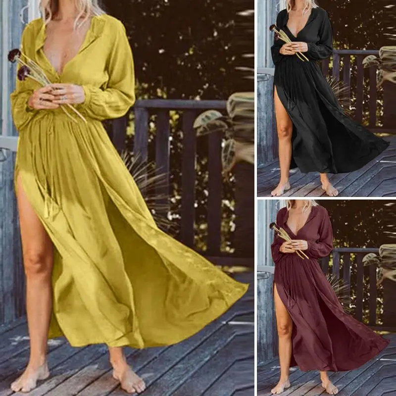 Платье ZANZEA женское пляжное в богемном стиле, длинный сарафан с рукавом до локтя и разрезом, повседневный однотонный длинный сарафан на пуговицах, лето