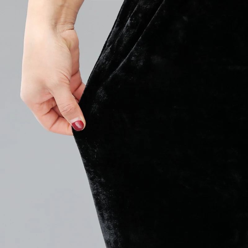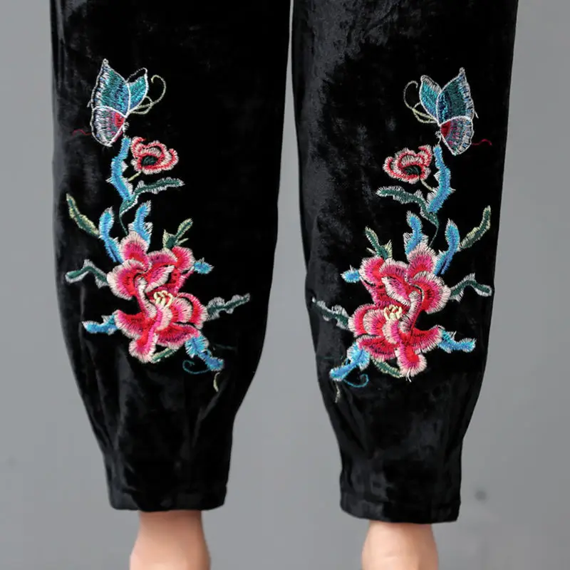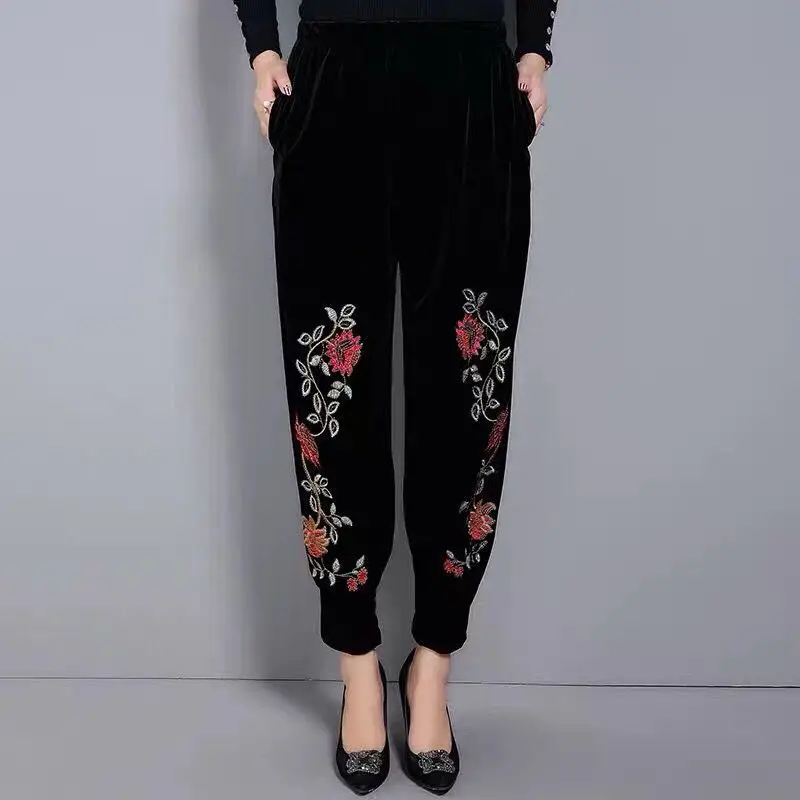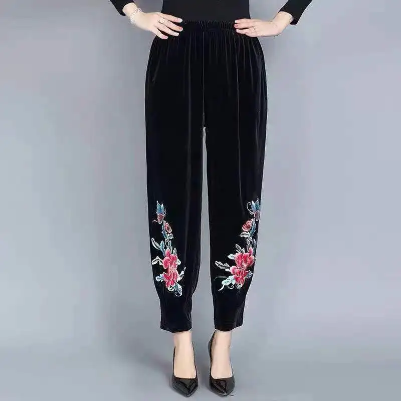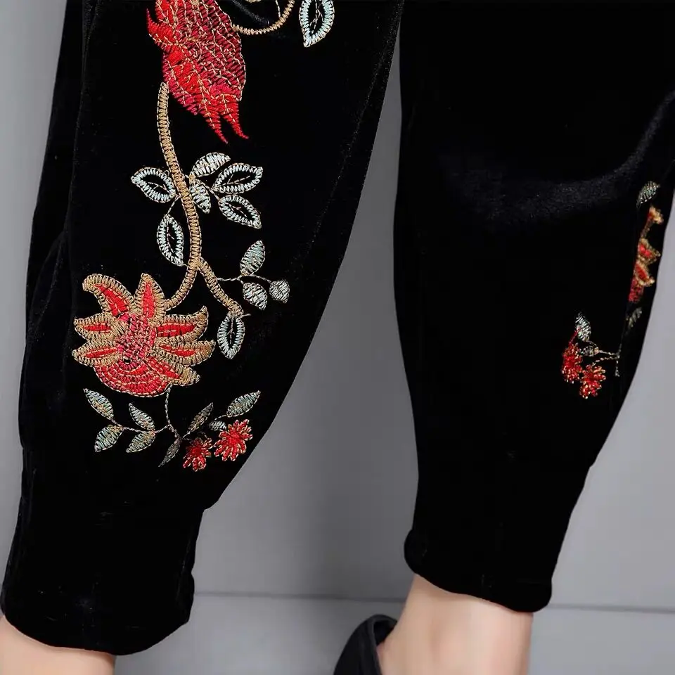 Женские брюки размера плюс с высокой талией, бархатные брюки, черные, с вышивкой, до щиколотки, брюки, свободные, женские, повседневные