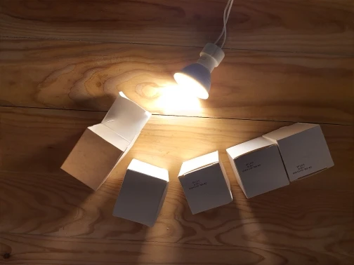 Приходит в коробочке из тонкого картона. Собственно коробочка измята до неприличия, но лампа на удивление цела. Свет холодный.