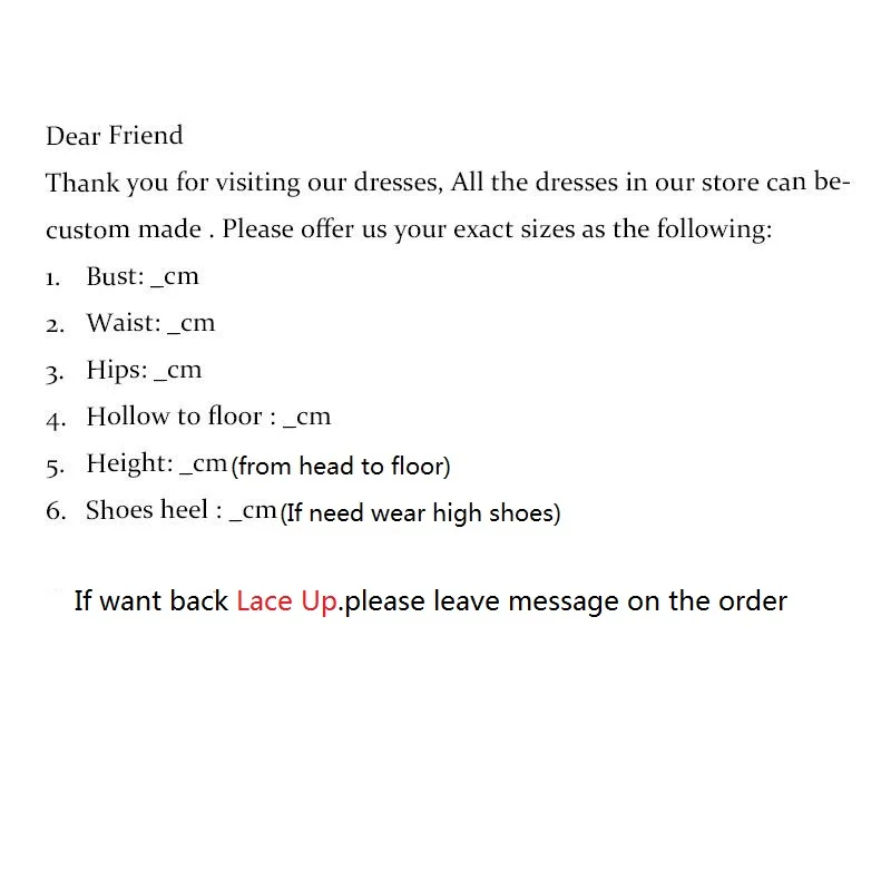 4. Платье может быть изготовлено по индивидуальному размеру, цвету, дизайну. Мы настоятельно рекомендуем вам найти профессионального портного, который будет тщательно измерять для вас, следуя инструкциям по изготовлению замеров, прежде чем покупать платье онлайн.