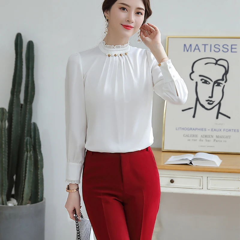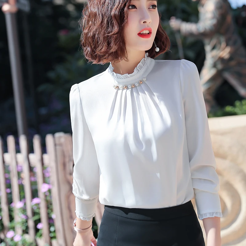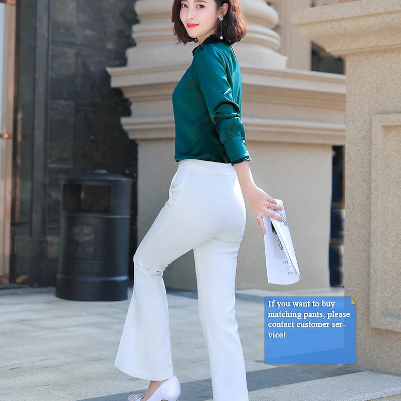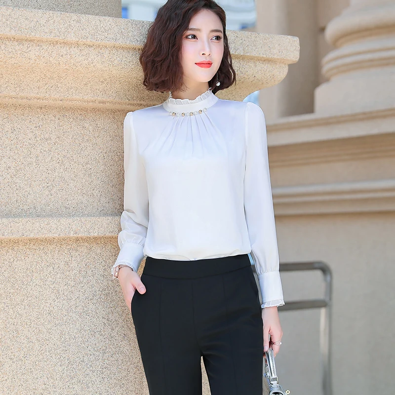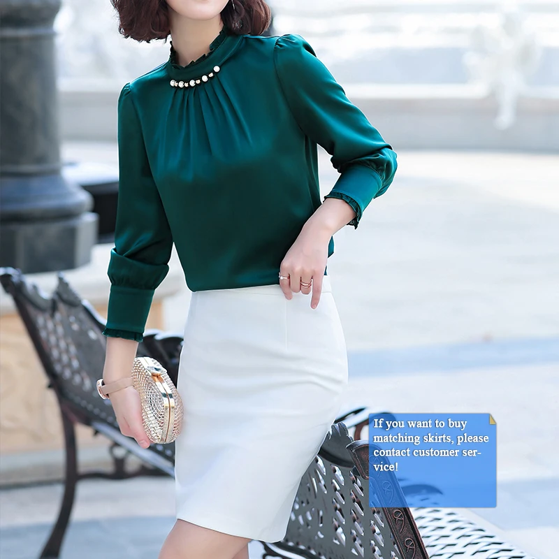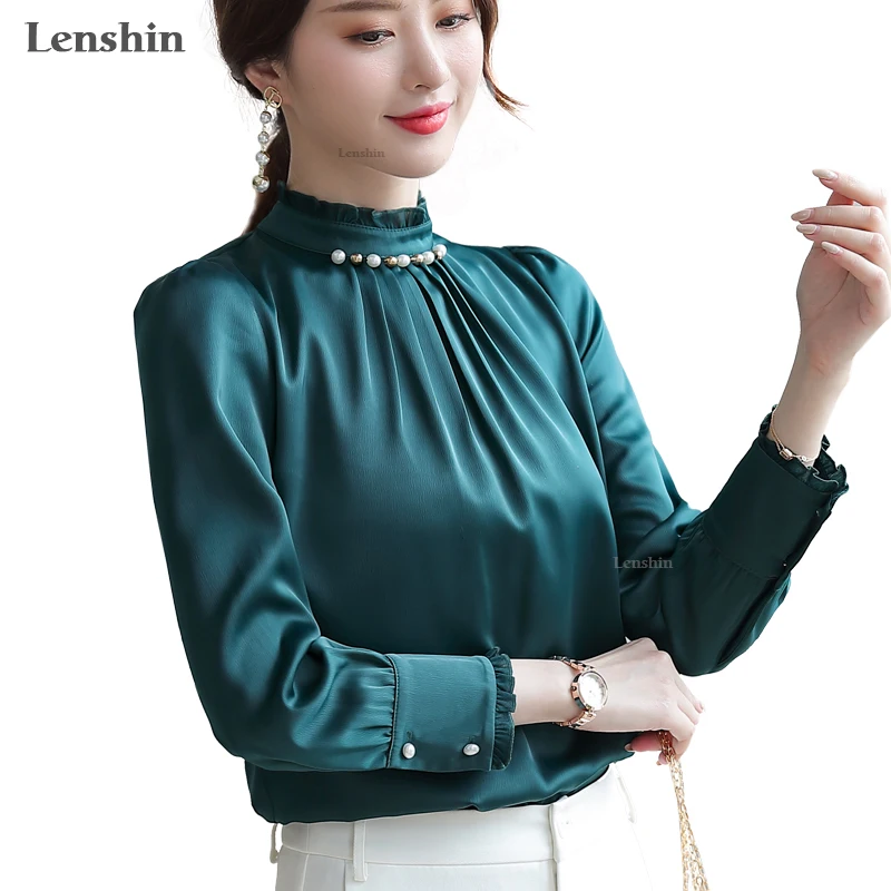 Сатиновая рубашка Lenshin с круглым вырезом и длинным рукавом Высококачественная блузка с воротником из бисера офисные женские свободные Стильные топы для женщин