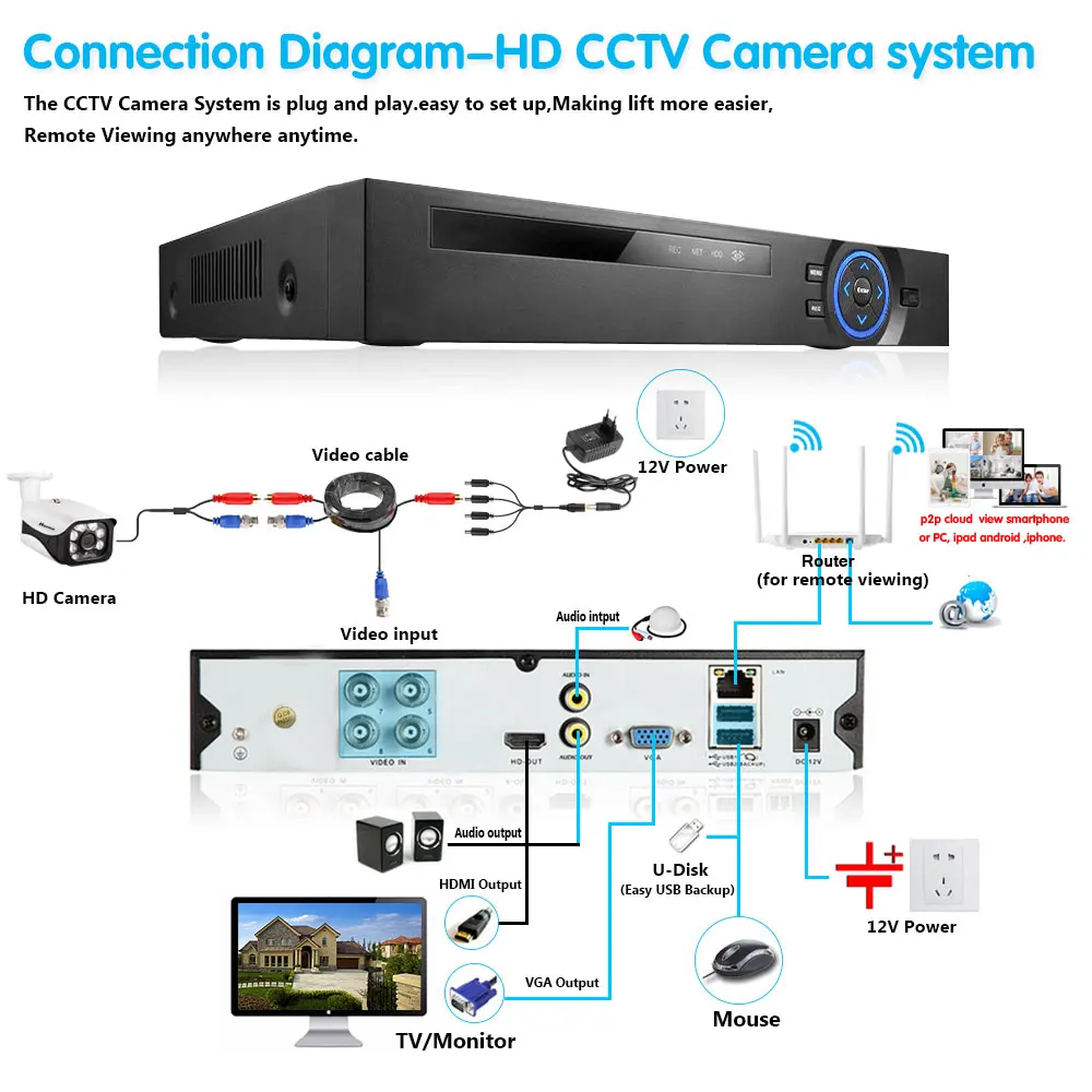 Простая настройка, всего 4 шага для просмотра мобильный телефон, просмотра видео в режиме реального времени из любого места и в любое время с помощью смартфона,Таблица или ПК с передовой технологией P2P, вы можете получить удаленный доступ к вашей системе в течение нескольких минут или меньше, нет необходимости в переадресации,Удаленный доступ никогда не был таким простым!