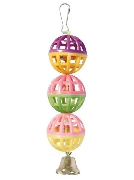Игрушка для птиц в виде 3х разноцветных шариков с бубенцами и колокольчиком.