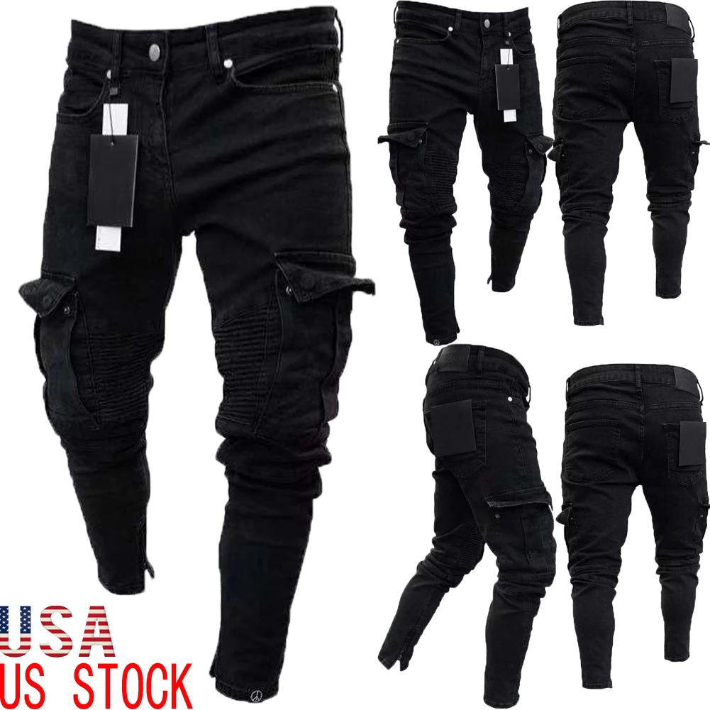 Джинсы-карго мужские скинни, длинные брюки из денима, армейские брюки-байкеры, Стрейчевые рабочие штаны с карманами, черные