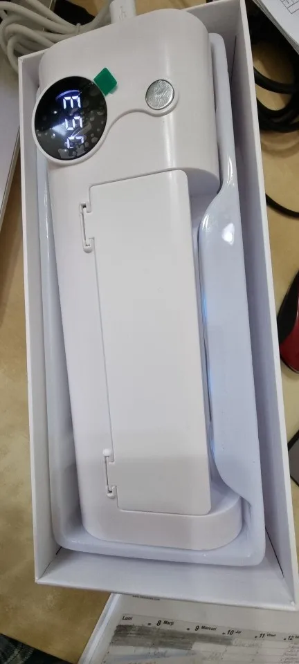 Идеально! Клей качественный (3 м) и имеет зарядный кабель для внутреннего аккумулятора, совместимый с любым мобильным зарядным устройством. После установки это выглядит фантастически и прекрасно работает. Вы активируете его кнопкой после каждого использования, и у него есть таймер, который выключается, когда вы заканчиваете дезинфекцию.