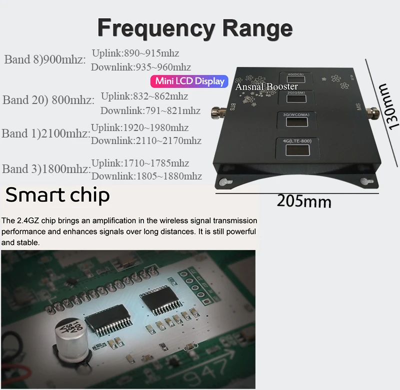 Россия Band 20)LTE800 900 1800 2100 четырехдиапазонный мобильный усилитель сигнала LTE GSM WCDMA UMTS 4G Сотовый усилитель 2g 3g 4g ретранслятор сигнала Характеристика: 1. Высокий коэффициент усиления: 70 дБ. Покрытие: 550 квадратных метров без препятствий 2. Улучшите 4g lte 800 2G GSM 900mhz, 3G UMTS WCDMA 2100mhz,4G DCS LTE 1800mhz одновременно. 3. Поддержка более 25-30 сотовых телефонов для одновременного использования 4. Уменьшает мощность передачи мобильного телефона 5. Легко установить. Эта ссылка является усилителем и источником питания. 6. ЖК-дисплей и светодиодный сигнальный светильник указывают на состояние сигнала. 7. Подходит для: России, Испании, Франции, Бразилии, Европы, Азии и т. Д. 8. Гарантия: 1 год! 【Лучший голос и дата 】получайте меньше сброшенных звонков, лучшее качество голоса, более быстрая загрузка и загрузка. Вы можете поделиться с вами приятным временем с помощью хорошего голосового звонка, и вы не беспокоитесь о том, что звонок неожиданно отпадет.