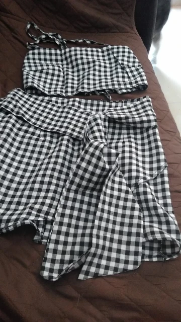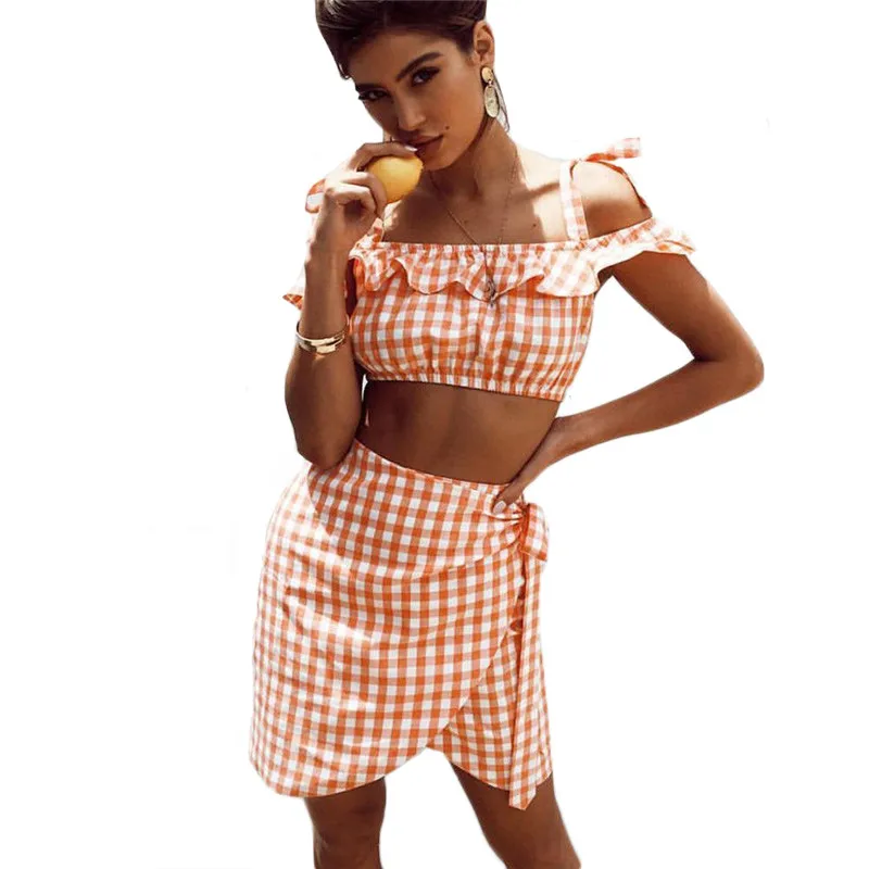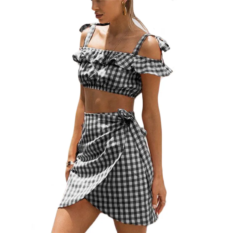 Комплект модной одежды для женщин, летний клетчатый костюм из 2 предметов, укороченный топ с открытыми плечами и мини-юбка, бандажный нарядный костюм вечерние и клуба