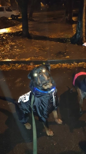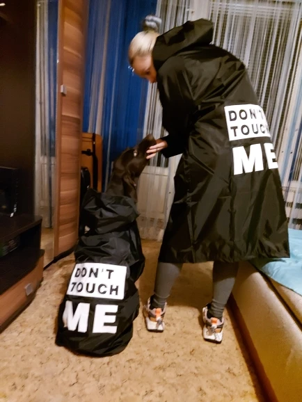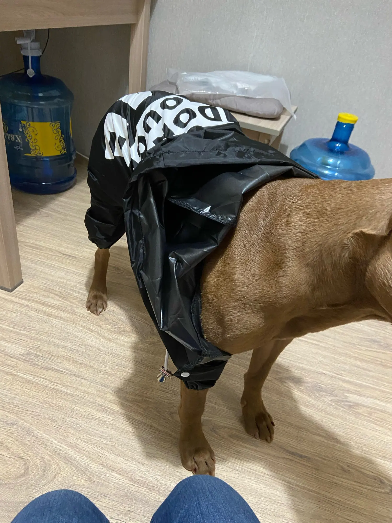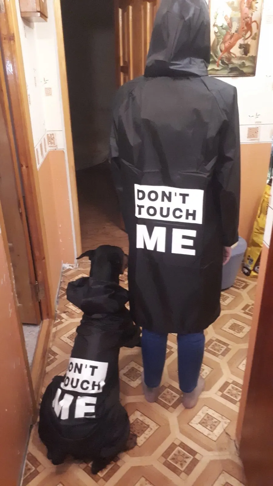 слишком круто, слишком стильно, слишком отлично! только старайтесь точнее подбирать размеры для собаки. но мы постарались и совсем не ошиблись. круто очень круто! смотрите фото тому подтверждение. на человека дождевик размер 40-46. но 46 в привык. советую товар 100%