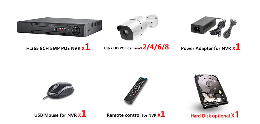 1 сетевой видеорегистратор 8CH 4K POE NVR;2/4/6/8 X HD POE IP 5.0MP для дома и улицы ИК Ночного Видения Всепогодные камеры;1 X Блок питания для NVR;1 х USB мышь для NVR;1 компакт-диск программного обеспечения для NVR;1 пульт дистанционного управления для NVR;Жесткий диск опционально!