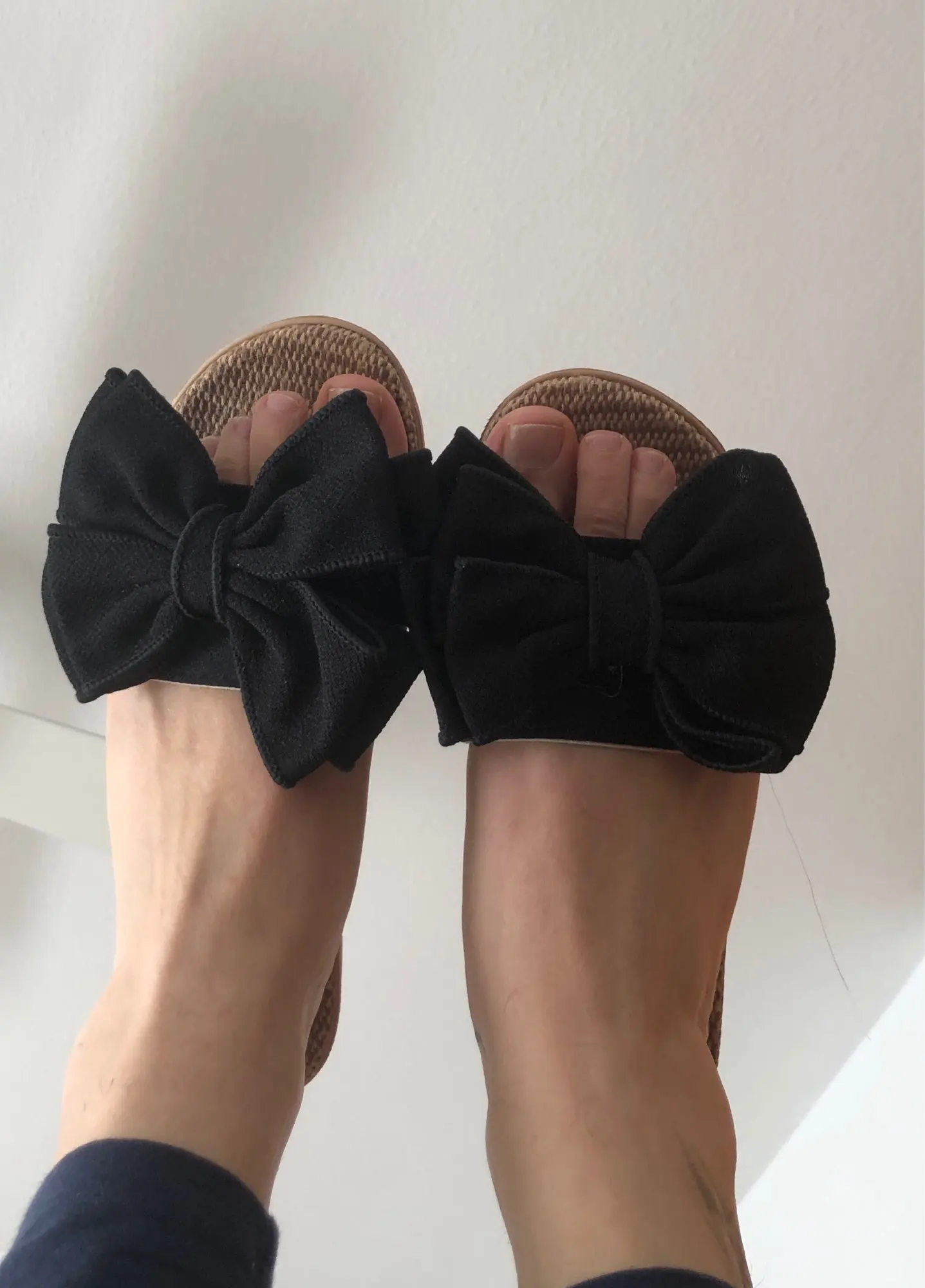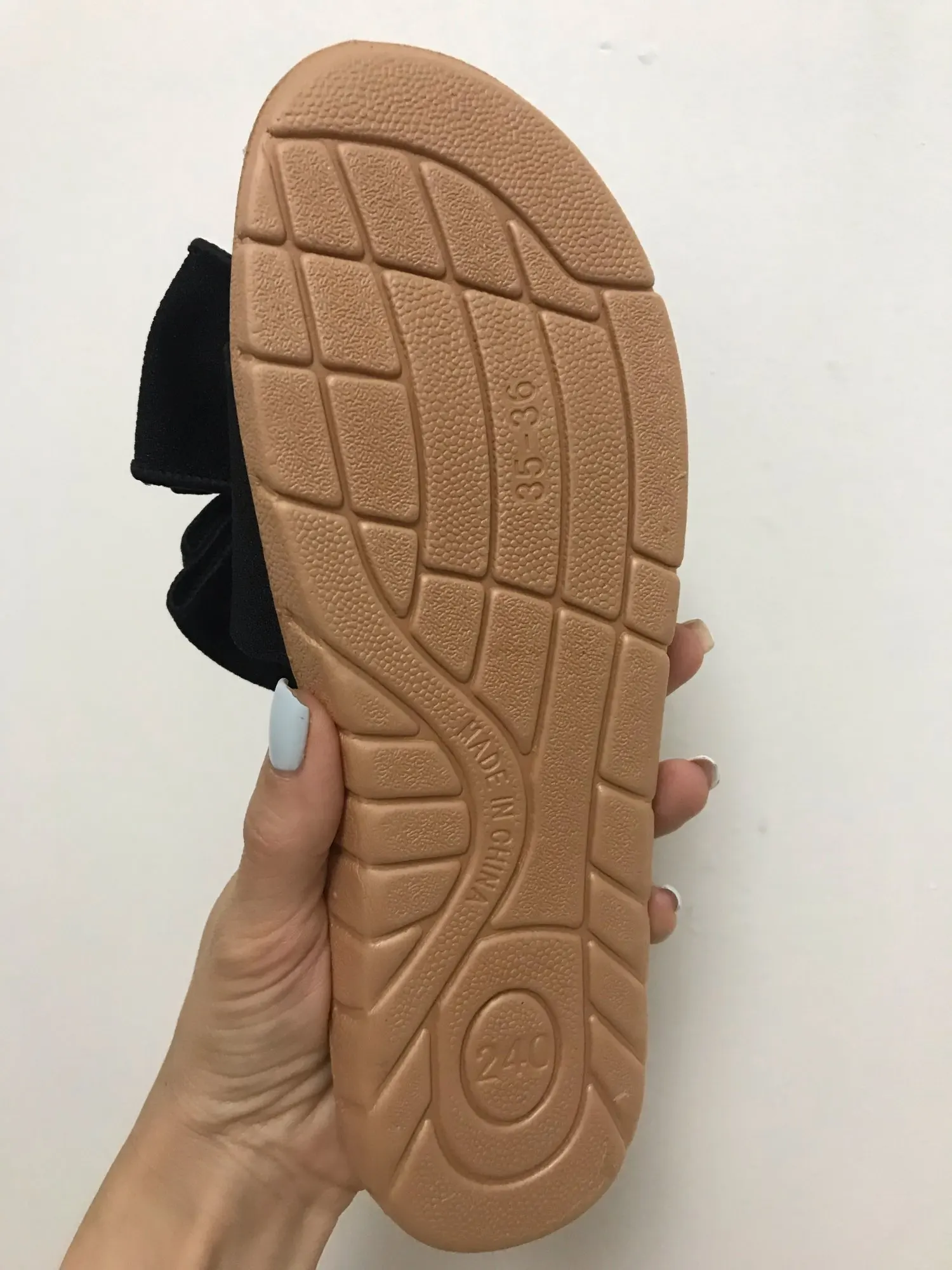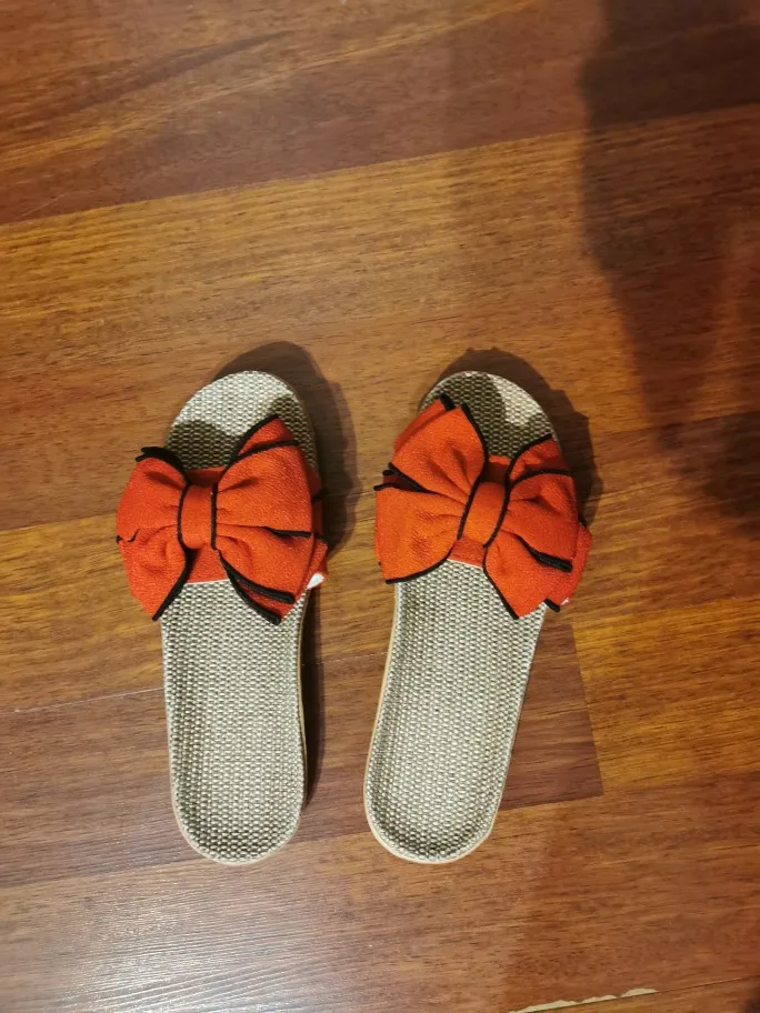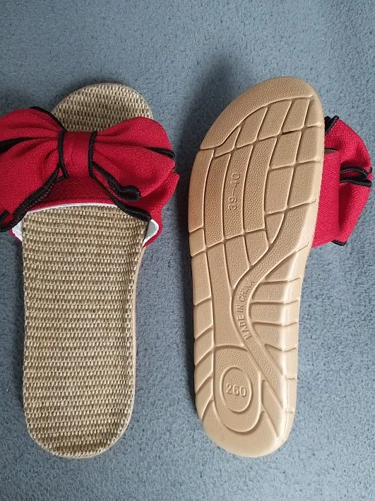 Тапки с виду очень красивые. Качество на первый взгляд неплохое, проклеены хорошо. Из минусов: не прошитые, а значит срок службы может быть непродолжительным. Присутствуют следы клея, но не критично, остатки клея легко убираются в месте склейки банта. Размер на 36 (23,5 см) подошли, можно было бы и на размер больше, но боюсь на мою узкую ногу были бы широки. В целом довольно размер тоже ок, на фото детали.
