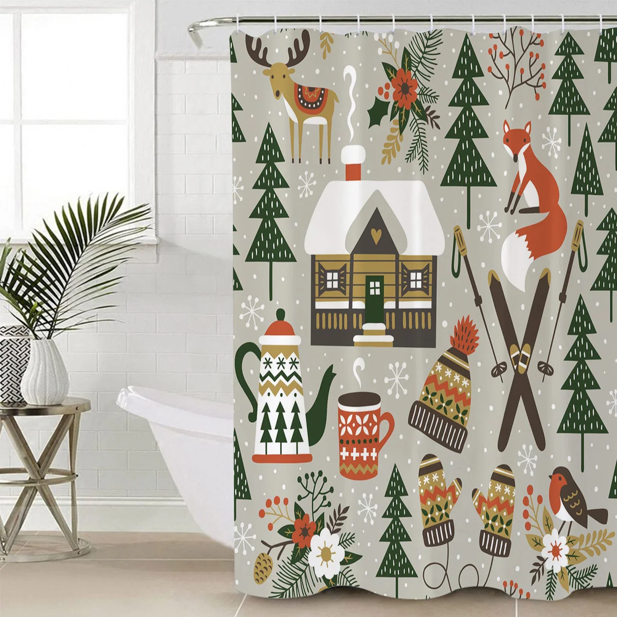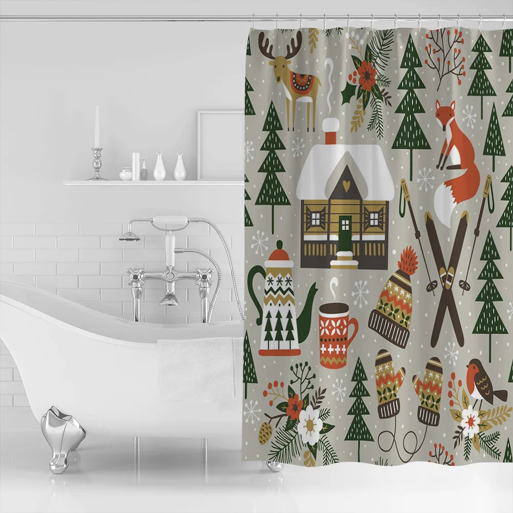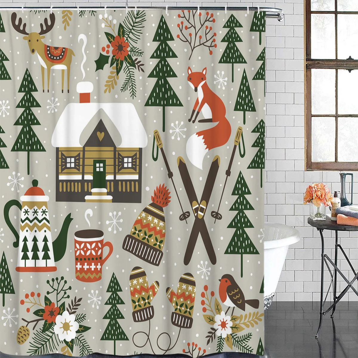 Занавеска для душа из полиэстера, водонепроницаемая, с изображением рождественских оленей, Лис, цветов, лыж, перчатки кофейного цвета, птиц, зеленых чашек