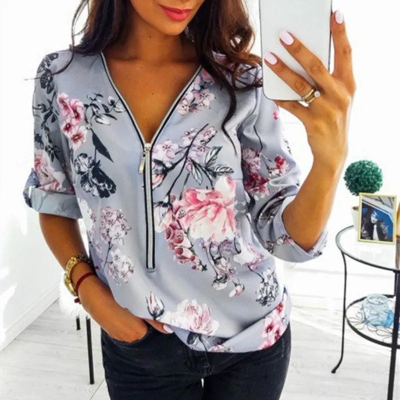 Блузка женская шифоновая, с цветочным принтом, на молнии, с V-образ...
