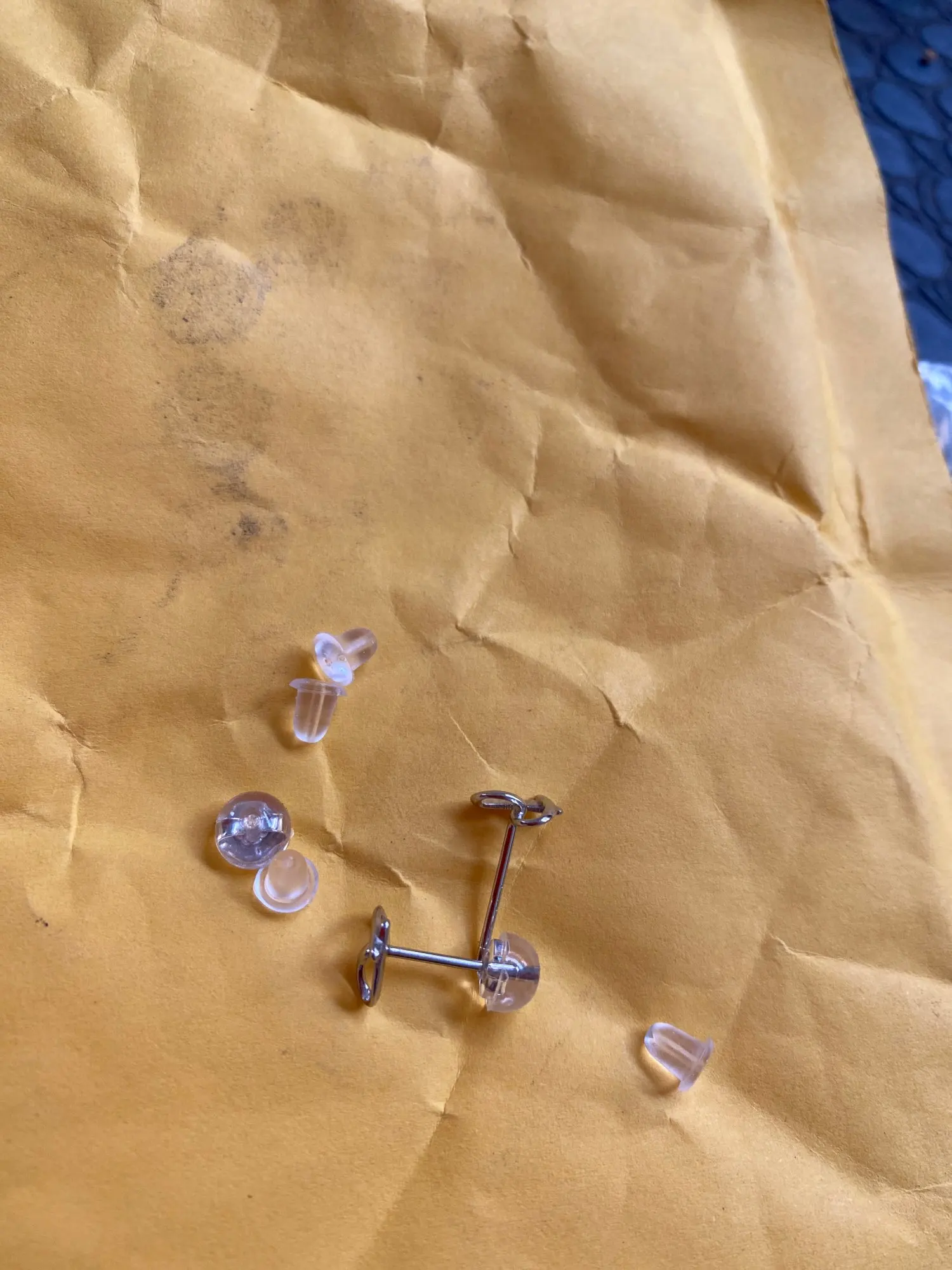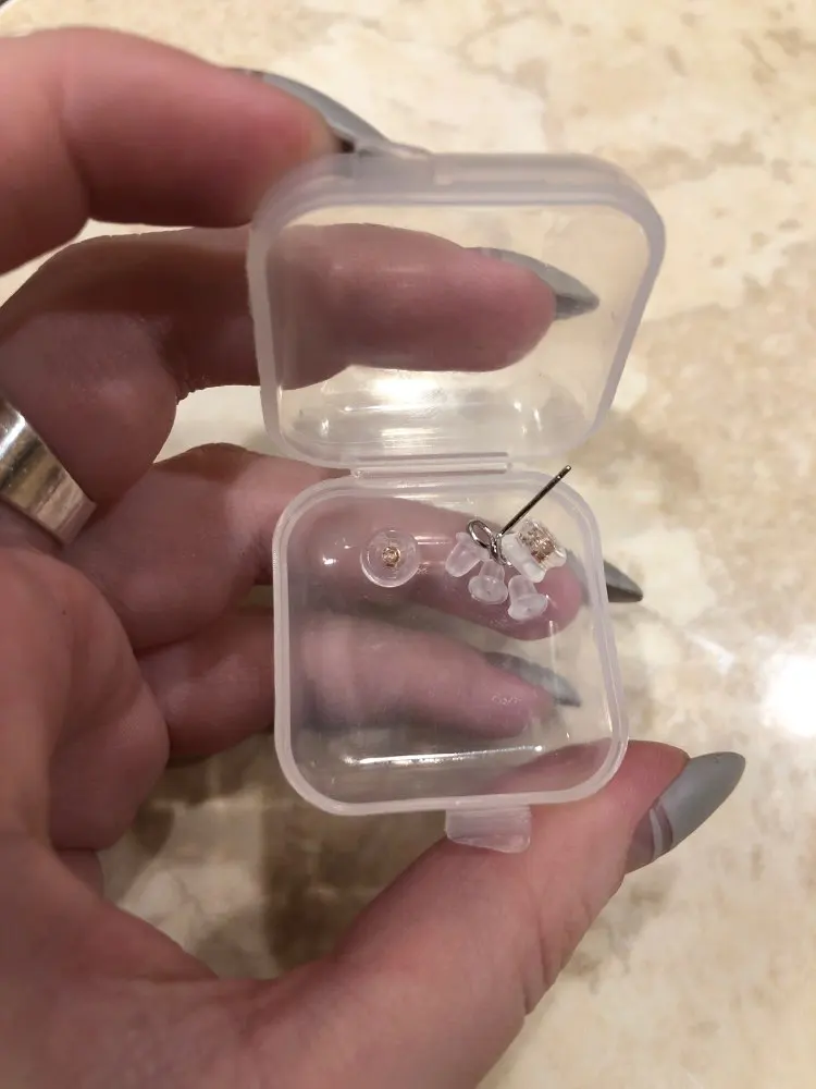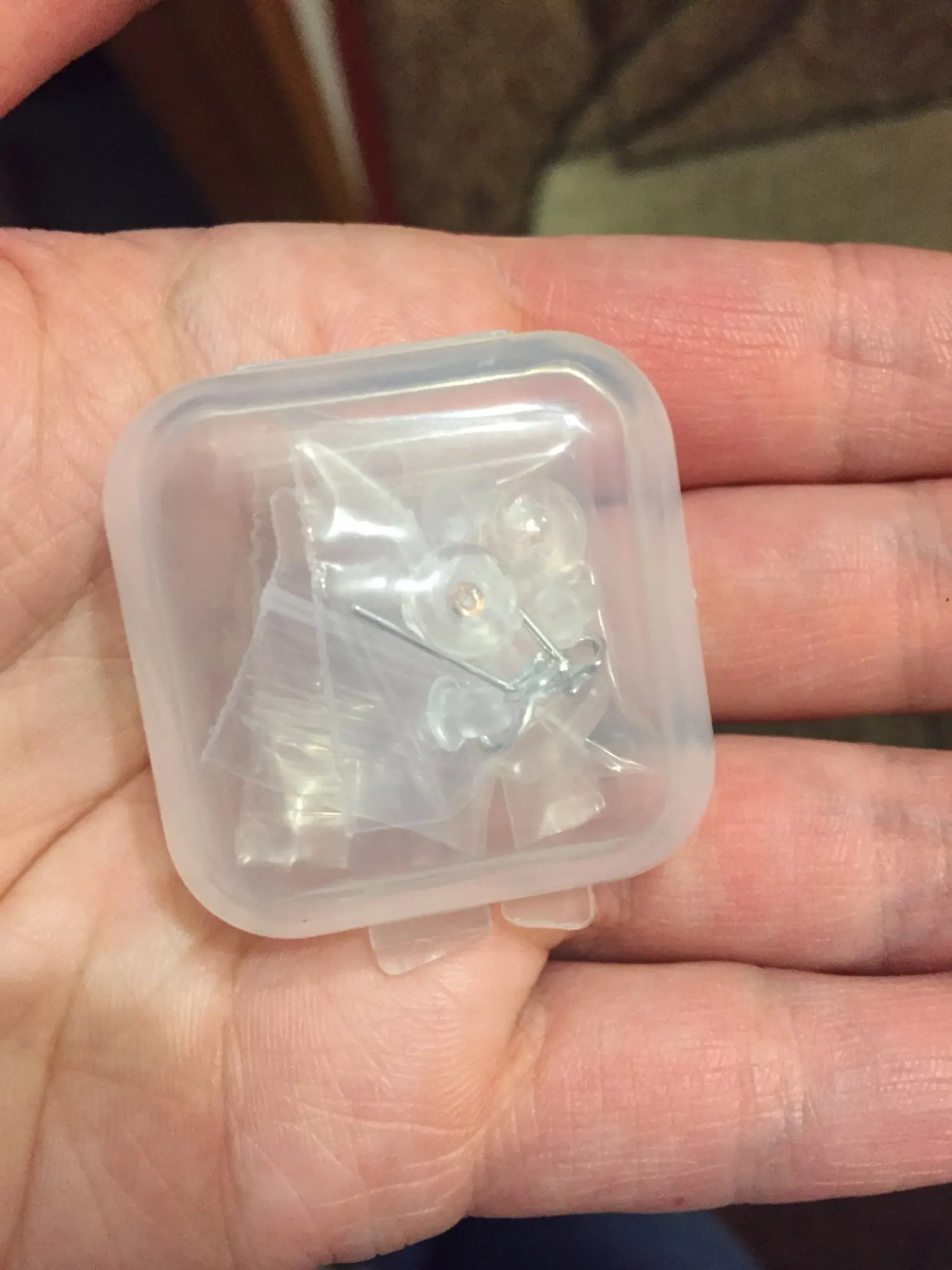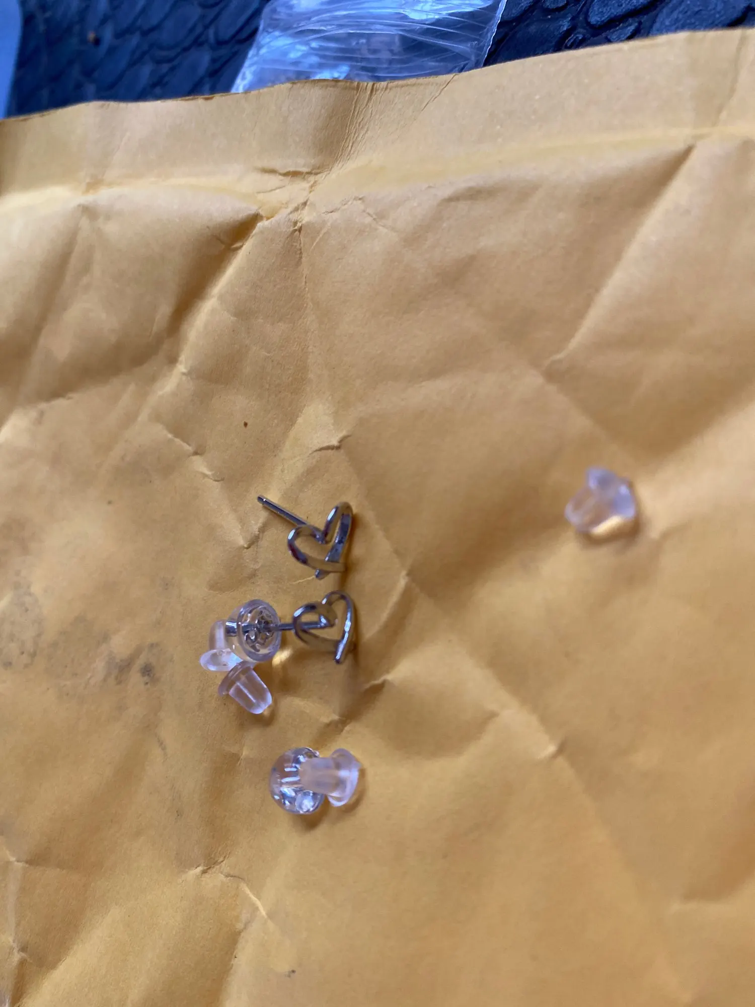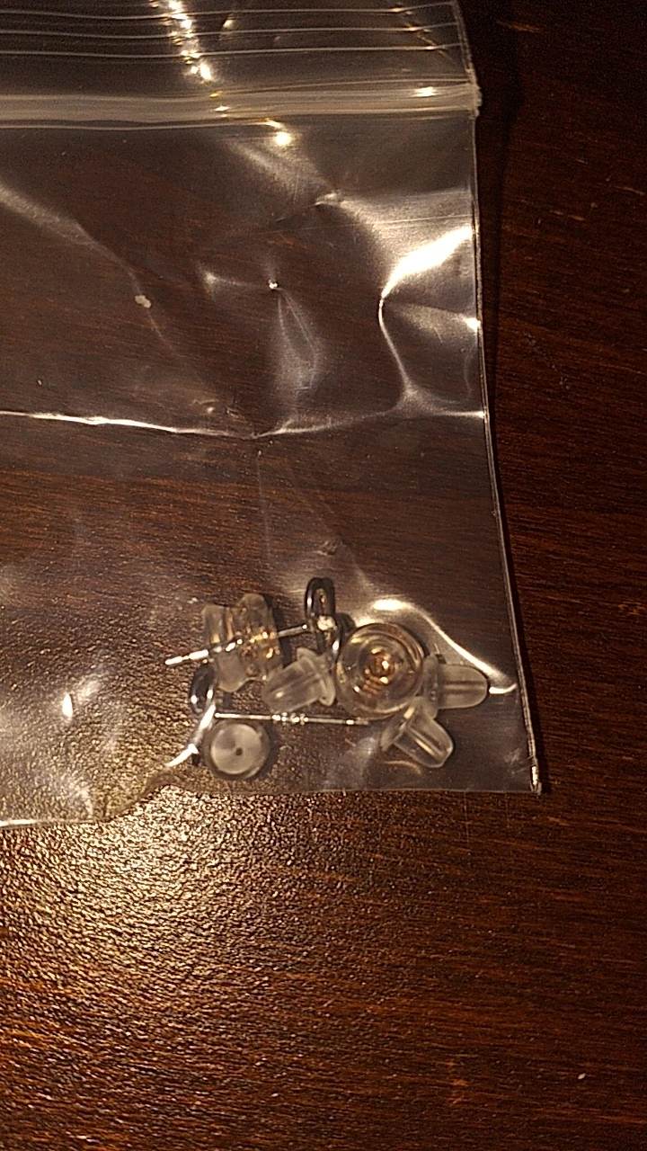 Крошечные хорошенькие сережки. В удобной пластиковой коробочке. Положили много силиконовых застежек. Спасибо большое