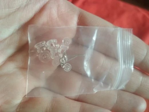 Милые маленькие сережки. Стоит проба, ходила в них целый день, ушки на болят и не покраснели, вообще не чувствую их на ушах. очень понравилось. Так же пришло несколько силиконовых заклёпок к ним