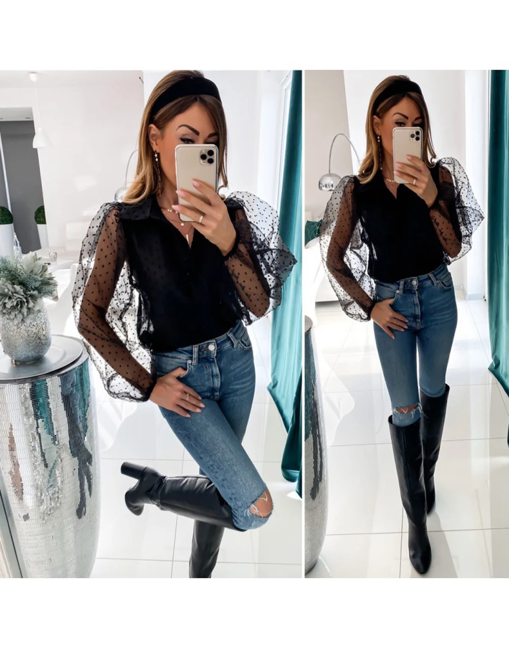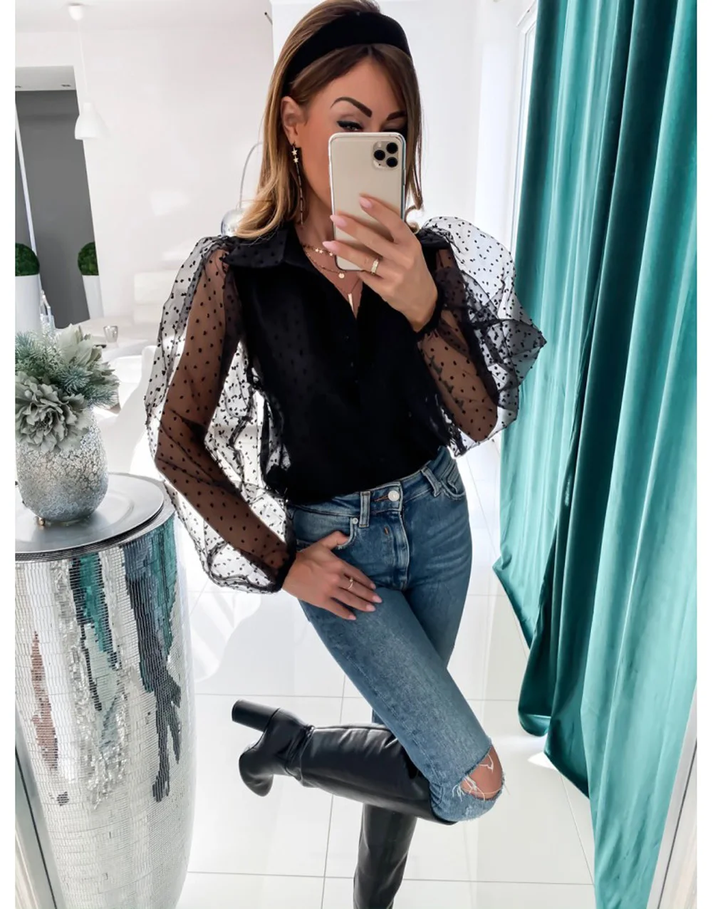 Женская блузка в горошек, прозрачная сетчатая рубашка с пышными дли...