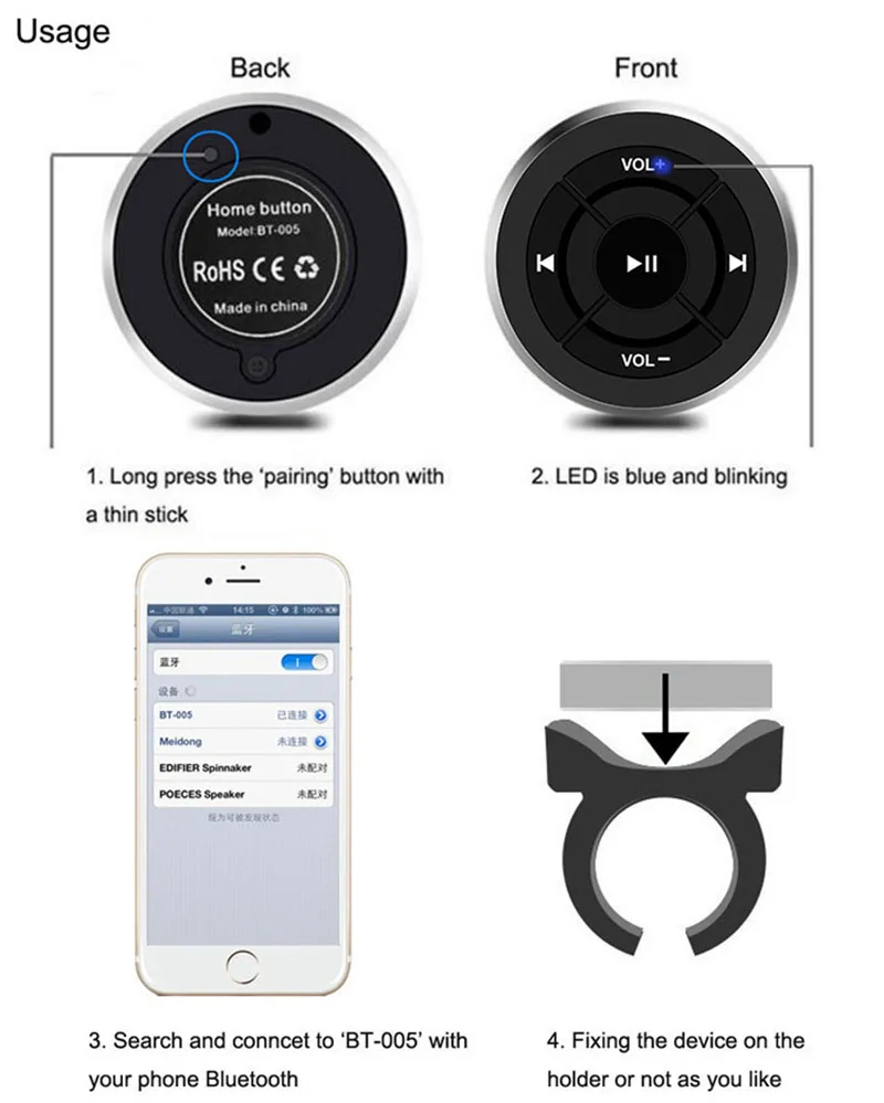 Максимальные характеристики: Поддержка сопряжения телефона с пультом дистанционного управления в то же время также может сопрягать дополнительные устройства Bluetooth. Например: если вы телефон, Автомобильный bluetooth MP3-плеер, Bluetooth автомобильный dvd, Bluetooth колонки и Bluetooth приемник и т. Д. Уже подключен к вашему автомобилю И других устройств Bluetooth. Затем Кнопка bluetooth media может быть подключена к этому продукту bluetooth. Управление воспроизведением музыки на других устройствах одновременно. Небольшой размер, простота в эксплуатации, длительное время работы в режиме ожидания, для автомобильного руля, мотоцикла с собственной ручкой, сделает вашу жизнь более удобной и веселой