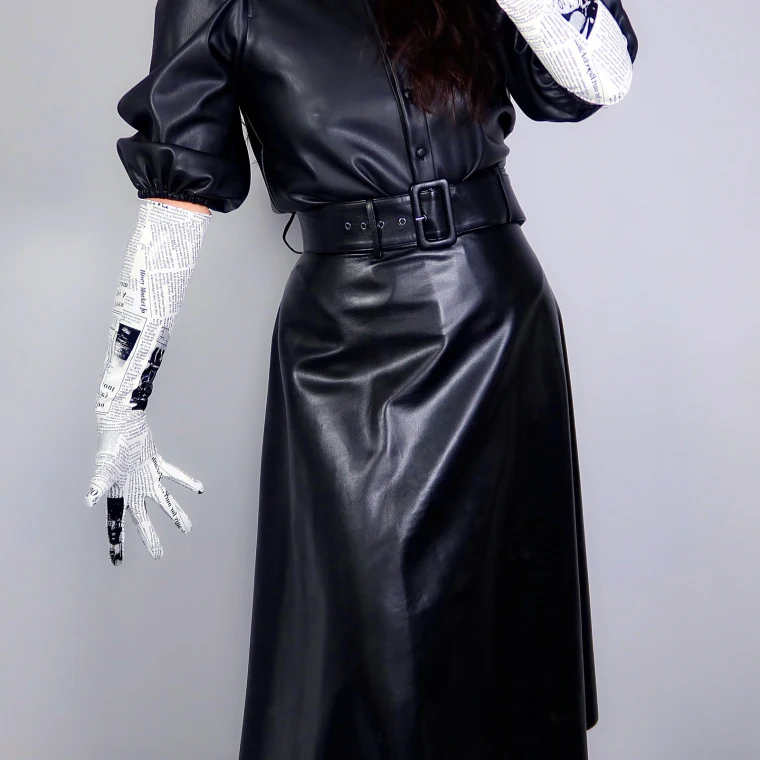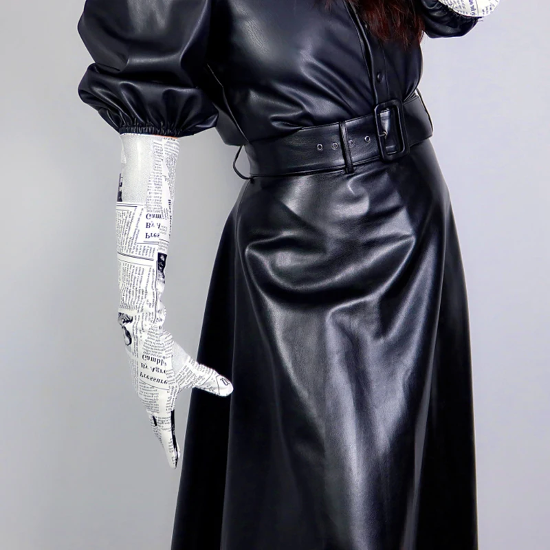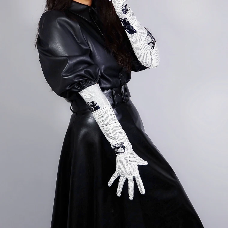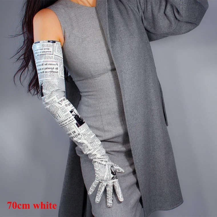 Латексные длинные перчатки из искусственной кожи, 28 дюймов, 70 см, с газетным принтом, черные, белые, контрастные, женские длинные кожаные перчатки WPU214